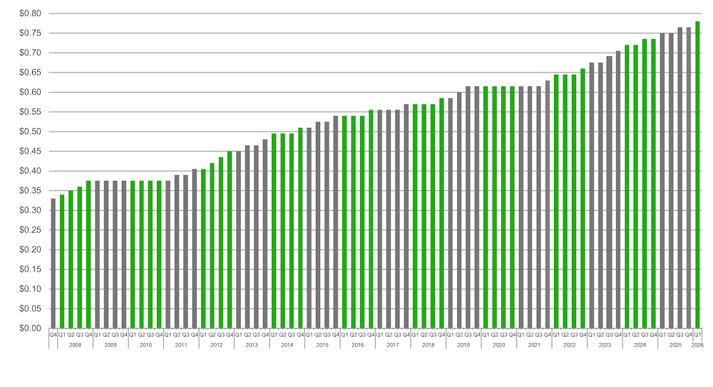 | Last Quarter Ended | $0.765 | $0.735 | 4.08% |
