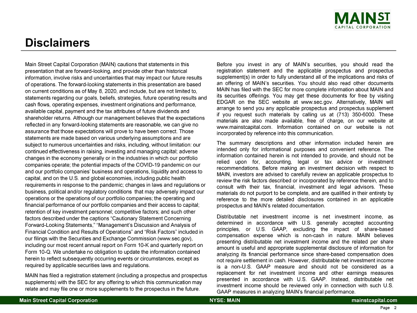 mainstcapital.com NYSE: MAIN Main Street Capital Corporation Page 2 Disclaimers Main Street Capital Corporation (MAIN) cautions that statements in this presentation that are forward - looking, and provide other than historical information, involve risks and uncertainties that may impact our future results of operations. The forward - looking statements in this presentation are based on current conditions as of May 8, 2020, and include, but are not limited to, statements regarding our goals, beliefs, strategies, future operating results and cash flows, operating expenses, investment originations and performance, available capital, payment and the tax attributes of future dividends and shareholder returns. Although our management believes that the expectations reflected in any forward - looking statements are reasonable, we can give no assurance that those expectations will prove to have been correct. Those statements are made based on various underlying assumptions and are subject to numerous uncertainties and risks, including, without limitation: our continued effectiveness in raising, investing and managing capital; adverse changes in the economy generally or in the industries in which our portfolio companies operate; the potential impacts of the COVID - 19 pandemic on our and our portfolio companies’ business and operations, liquidity and access to capital, and on the U.S. and global economies, including public health requirements in response to the pandemic; changes in laws and regulations or business, political and/or regulatory conditions that may adversely impact our operations or the operations of our portfolio companies; the operating and financial performance of our portfolio companies and their access to capital; retention of key investment personnel; competitive factors; and such other factors described under the captions “Cautionary Statement Concerning Forward - Looking Statements,” “Management’s Discussion and Analysis of Financial Condition and Results of Operations” and “Risk Factors” included in our filings with the Securities and Exchange Commission (www.sec.gov), including our most recent annual report on Form 10 - K and quarterly report on Form 10 - Q. We undertake no obligation to update the information contained herein to reflect subsequently occurring events or circumstances, except as required by applicable securities laws and regulations. MAIN has filed a registration statement (including a prospectus and prospectus supplements) with the SEC for any offering to which this communication may relate and may file one or more supplements to the prospectus in the future. Before you invest in any of MAIN’s securities, you should read the registration statement and the applicable prospectus and prospectus supplement(s) in order to fully understand all of the implications and risks of an offering of MAIN’s securities .. You should also read other documents MAIN has filed with the SEC for more complete information about MAIN and its securities offerings . You may get these documents for free by visiting EDGAR on the SEC website at www . sec . gov . Alternatively, MAIN will arrange to send you any applicable prospectus and prospectus supplement if you request such materials by calling us at ( 713 ) 350 - 6000 . These materials are also made available, free of charge, on our website at www . mainstcapital . com . Information contained on our website is not incorporated by reference into this communication . The summary descriptions and other information included herein are intended only for informational purposes and convenient reference . The information contained herein is not intended to provide, and should not be relied upon for, accounting, legal or tax advice or investment recommendations . Before making an investment decision with respect to MAIN, investors are advised to carefully review an applicable prospectus to review the risk factors described or incorporated by reference therein, and to consult with their tax, financial, investment and legal advisors . These materials do not purport to be complete, and are qualified in their entirety by reference to the more detailed disclosures contained in an applicable prospectus and MAIN’s related documentation . Distributable net investment income is net investment income, as determined in accordance with U . S . generally accepted accounting principles, or U . S . GAAP, excluding the impact of share - based compensation expense which is non - cash in nature . MAIN believes presenting distributable net investment income and the related per share amount is useful and appropriate supplemental disclosure of information for analyzing its financial performance since share - based compensation does not require settlement in cash . However, distributable net investment income is a non - U . S . GAAP measure and should not be considered as a replacement for net investment income and other earnings measures presented in accordance with U . S . GAAP . Instead, distributable net investment income should be reviewed only in connection with such U . S . GAAP measures in analyzing MAIN’s financial performance .