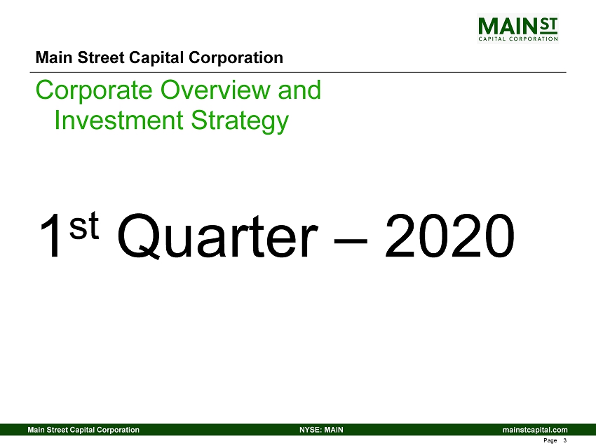 mainstcapital.com NYSE: MAIN Main Street Capital Corporation Page 2 Disclaimers Main Street Capital Corporation (MAIN) cautions that statements in this presentation that are forward - looking, and provide other than historical information, involve risks and uncertainties that may impact our future results of operations. The forward - looking statements in this presentation are based on current conditions as of May 8, 2020, and include, but are not limited to, statements regarding our goals, beliefs, strategies, future operating results and cash flows, operating expenses, investment originations and performance, available capital, payment and the tax attributes of future dividends and stakeholder returns. Although our management believes that the expectations reflected in any forward - looking statements are reasonable, we can give no assurance that those expectations will prove to have been correct. Those statements are made based on various underlying assumptions and are subject to numerous uncertainties and risks, including, without limitation: our continued effectiveness in raising, investing and managing capital; adverse changes in the economy generally or in the industries in which our portfolio companies operate; the potential impacts of the COVID - 19 pandemic on our and our portfolio companies’ business and operations, liquidity and access to capital, and on the U.S. and global economies, including public health requirements in response to the pandemic; changes in laws and regulations or business, political and/or regulatory conditions that may adversely impact our operations or the operations of our portfolio companies; the operating and financial performance of our portfolio companies and their access to capital; retention of key investment personnel; competitive factors; and such other factors described under the captions “Cautionary Statement Concerning Forward - Looking Statements,” “Management’s Discussion and Analysis of Financial Condition and Results of Operations” and “Risk Factors” included in our filings with the Securities and Exchange Commission (www.sec.gov), including our most recent annual report on Form 10 - K and quarterly report on Form 10 - Q. We undertake no obligation to update the information contained herein to reflect subsequently occurring events or circumstances, except as required by applicable securities laws and regulations. MAIN has filed a registration statement (including a prospectus and prospectus supplements) with the SEC for any offering to which this communication may relate and may file one or more supplements to the prospectus in the future. Before you invest in any of MAIN’s securities, you should read the registration statement and the applicable prospectus and prospectus supplement(s) in order to fully understand all of the implications and risks of an offering of MAIN’s securities . You should also read other documents MAIN has filed with the SEC for more complete information about MAIN and its securities offerings . You may get these documents for free by visiting EDGAR on the SEC website at www . sec . gov . Alternatively, MAIN will arrange to send you any applicable prospectus and prospectus supplement if you request such materials by calling us at ( 713 ) 350 - 6000 . These materials are also made available, free of charge, on our website at www . mainstcapital . com . Information contained on our website is not incorporated by reference into this communication . The summary descriptions and other information included herein are intended only for informational purposes and convenient reference . The information contained herein is not intended to provide, and should not be relied upon for, accounting, legal or tax advice or investment recommendations . Before making an investment decision with respect to MAIN, investors are advised to carefully review an applicable prospectus to review the risk factors described or incorporated by reference therein, and to consult with their tax, financial, investment and legal advisors . These materials do not purport to be complete, and are qualified in their entirety by reference to the more detailed disclosures contained in an applicable prospectus and MAIN’s related documentation . Distributable net investment income is net investment income, as determined in accordance with U . S . generally accepted accounting principles, or U . S . GAAP, excluding the impact of share - based compensation expense which is non - cash in nature . MAIN believes presenting distributable net investment income and the related per share amount is useful and appropriate supplemental disclosure of information for analyzing its financial performance since share - based compensation does not require settlement in cash . However, distributable net investment income is a non - U . S . GAAP measure and should not be considered as a replacement for net investment income and other earnings measures presented in accordance with U . S . GAAP . Instead, distributable net investment income should be reviewed only in connection with such U . S . GAAP measures in analyzing MAIN’s financial performance .