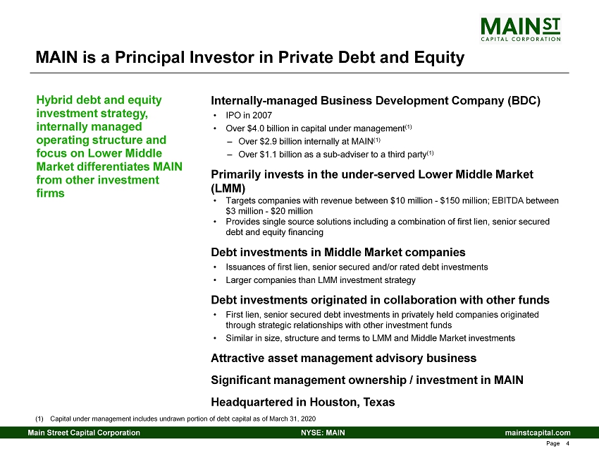 mainstcapital.com NYSE: MAIN Main Street Capital Corporation Page 3 Main Street Capital Corporation Corporate Overview and Investment Strategy 1 st Quarter – 2020