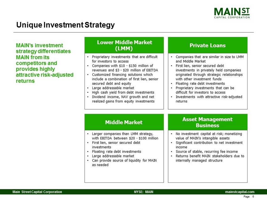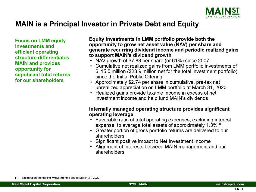 mainstcapital.com NYSE: MAIN Main Street Capital Corporation Page 5 MAIN is a Principal Investor in Private Debt and Equity Long - term focus on delivering our shareholders sustainable growth in net asset value and recurring dividends per share Consistent cash dividend yield – dividends paid monthly • MAIN has never decreased its monthly dividend rate • 86% increase in monthly dividends from $0.33 per share paid in Q4 2007 to declared dividends of $0.615 per share for Q3 2020 Owns three Small Business Investment Company (SBIC) Funds • Main Street Mezzanine Fund (2002 vintage), Main Street Capital II (2006 vintage) and Main Street Capital III (2016 vintage) • Provides access to 10 - year, low cost, fixed rate government - backed leverage Strong capitalization and liquidity position – stable, long - term debt and significant available liquidity to take advantage of opportunities • Favorable opportunities in capital markets through investment grade rating of BBB - /Stable from Standard & Poor’s Rating Services • Total SBIC debenture regulatory financing capacity of $350.0 million MAIN’s unique investment strategy, efficient operating structure and conservative capitalization are designed to provide sustainable, long - term growth in recurring monthly dividends and long - term capital appreciation to our shareholders