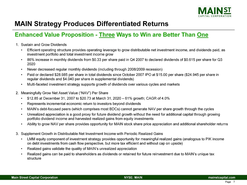 mainstcapital.com NYSE: MAIN Main Street Capital Corporation Page 6 MAIN is a Principal Investor in Private Debt and Equity Equity investments in LMM portfolio provide both the opportunity to grow net asset value (NAV) per share and generate recurring dividend income and periodic realized gains to support MAIN’s dividend growth • NAV growth of $7.88 per share (or 61%) since 2007 • Cumulative net realized gains from LMM portfolio investments of $115.5 million ($28.9 million net for the total investment portfolio) since the Initial Public Offering • Approximately $2.74 per share in cumulative, pre - tax net unrealized appreciation on LMM portfolio at March 31, 2020 • Realized gains provide taxable income in excess of net investment income and help fund MAIN’s dividends Internally managed operating structure provides significant operating leverage • Favorable ratio of total operating expenses, excluding interest expense, to average total assets of approximately 1.3% (1) • Greater portion of gross portfolio returns are delivered to our shareholders • Significant positive impact to Net Investment Income • Alignment of interests between MAIN management and our shareholders Focus on LMM equity investments and efficient operating structure differentiates MAIN and provides opportunity for significant total returns for our shareholders (1) Based upon the trailing twelve months ended March 31, 2020