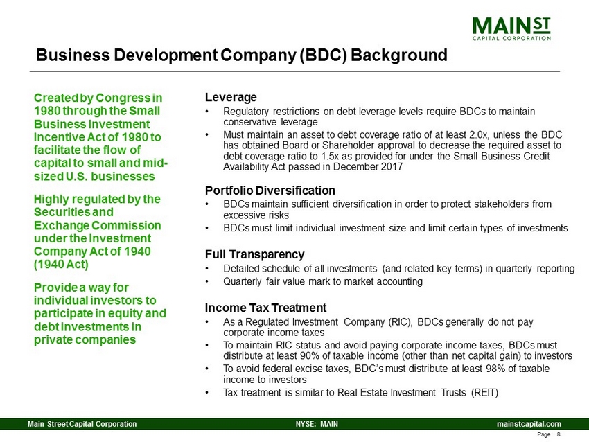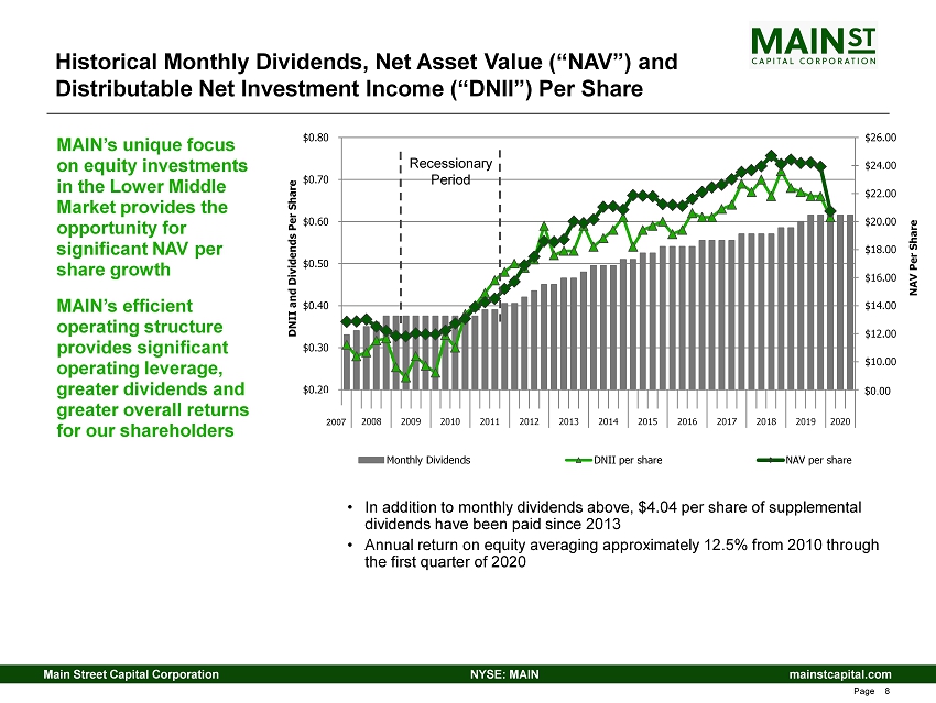 mainstcapital.com NYSE: MAIN Main Street Capital Corporation Page 7 MAIN Strategy Produces Differentiated Returns Enhanced Value Proposition - Three Ways to Win are Better Than One 1. Sustain and Grow Dividends • Efficient operating structure provides operating leverage to grow distributable net investment income, and dividends paid, as investment portfolio and total investment income grow • 86% increase in monthly dividends from $0.33 per share paid in Q4 2007 to declared dividends of $0.615 per share for Q3 2020 • Never decreased regular monthly dividends (including through 2008/2009 recession) • Paid or declared $28.985 per share in total dividends since October 2007 IPO at $15.00 per share ($24.945 per share in regular dividends and $4.040 per share in supplemental dividends) • Multi - faceted investment strategy supports growth of dividends over various cycles and markets 2. Meaningfully Grow Net Asset Value (“NAV”) Per Share • $12.85 at December 31, 2007 to $20.73 at March 31, 2020 – 61% growth; CAGR of 4.0% • Represents incremental economic return to investors beyond dividends • MAIN’s debt - focused peers (which comprises most BDCs) cannot generate NAV per share growth through the cycles • Unrealized appreciation is a good proxy for future dividend growth without the need for additional capital through growing portfolio dividend income and harvested realized gains from equity investments • Ability to grow NAV per share provides opportunity for MAIN stock share price appreciation and additional shareholder returns 3. Supplement Growth in Distributable Net Investment Income with Periodic Realized Gains • LMM equity component of investment strategy provides opportunity for meaningful realized gains (analogous to PIK income on debt investments from cash flow perspective, but more tax efficient and without cap on upside) • Realized gains validate the quality of MAIN’s unrealized appreciation • Realized gains can be paid to shareholders as dividends or retained for future reinvestment due to MAIN’s unique tax structure