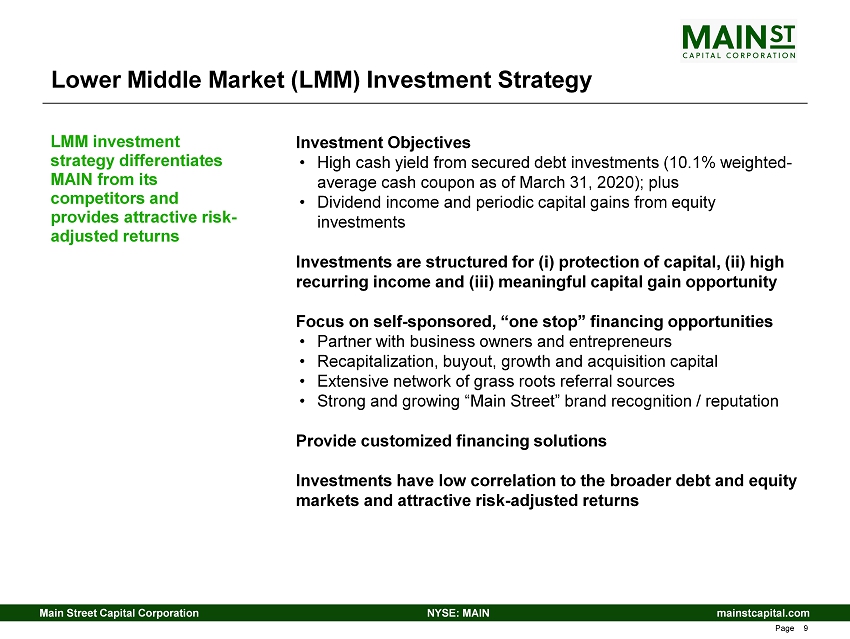 mainstcapital.com NYSE: MAIN Main Street Capital Corporation Page 8 $8.00 $10.00 $12.00 $14.00 $16.00 $18.00 $20.00 $22.00 $24.00 $26.00 $0.20 $0.30 $0.40 $0.50 $0.60 $0.70 $0.80 2008 2009 2010 2011 2012 2013 2014 2015 2016 2017 2018 2019 2020 NAV Per Share DNII and Dividends Per Share Monthly Dividends DNII per share NAV per share $0.00 Recessionary Period Historical Monthly Dividends, Net Asset Value (“NAV”) and Distributable Net Investment Income (“DNII”) Per Share MAIN’s unique focus on equity investments in the Lower Middle Market provides the opportunity for significant NAV per share growth MAIN’s efficient operating structure provides significant operating leverage, greater dividends and greater overall returns for our shareholders • In addition to monthly dividends above, $4.04 per share of supplemental dividends have been paid since 2013 • Annual return on equity averaging approximately 12.5% from 2010 through the first quarter of 2020 2007 207 2007