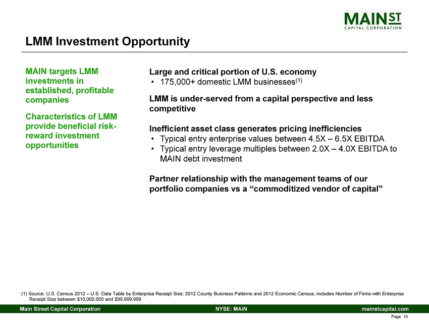 mainstcapital.com NYSE: MAIN Main Street Capital Corporation Page 9 Lower Middle Market (LMM) Investment Strategy Investment Objectives • High cash yield from secured debt investments (10.1% weighted - average cash coupon as of March 31, 2020); plus • Dividend income and periodic capital gains from equity investments Investments are structured for (i) protection of capital, (ii) high recurring income and (iii) meaningful capital gain opportunity Focus on self - sponsored, “one stop” financing opportunities • Partner with business owners and entrepreneurs • Recapitalization, buyout, growth and acquisition capital • Extensive network of grass roots referral sources • Strong and growing “Main Street” brand recognition / reputation Provide customized financing solutions Investments have low correlation to the broader debt and equity markets and attractive risk - adjusted returns LMM investment strategy differentiates MAIN from its competitors and provides attractive risk - adjusted returns