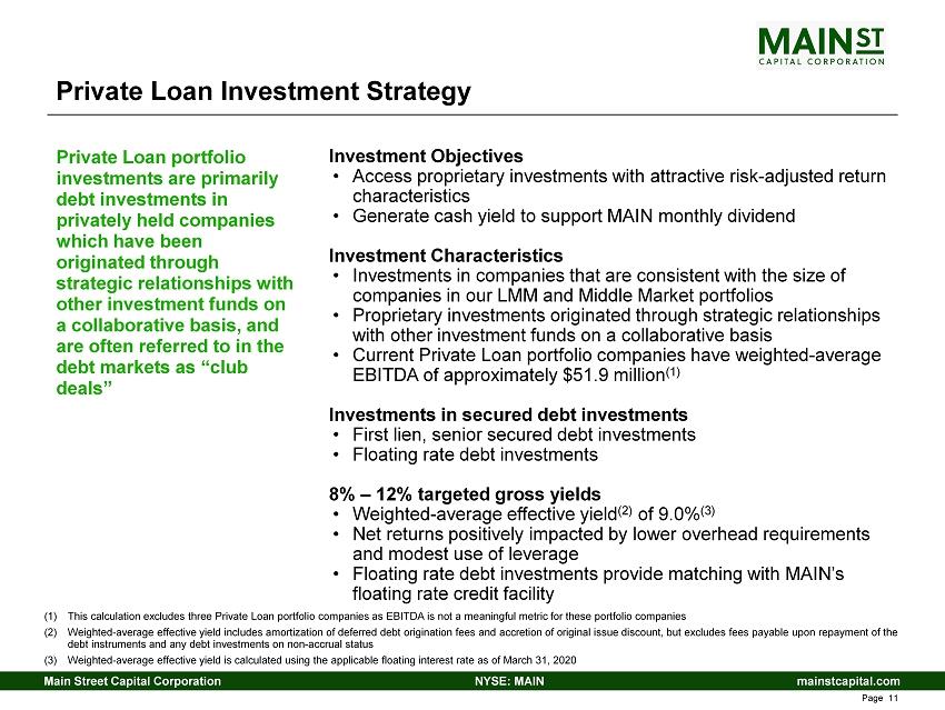 mainstcapital.com NYSE: MAIN Main Street Capital Corporation Page 10 Conservative Leverage (1) Assets at the BDC/RIC parent level represent the collateral available to MAIN’s debt capital market investors (2) As of March 31, 2020, MAIN’s credit facility had $740.0 million in total commitments with an accordion feature to increase up to $800.0 million; Borrowings under this facility are available to provide additional liquidity for investment and operational activities (3) DNII + interest expense / interest expense on a trailing twelve month basis (4) Calculated as total assets divided by total debt at par, including SBIC debt (5) Calculated per BDC regulations; SBIC Debentures are not included as “senior debt” for purposes of the BDC 200% asset coverage re quirements pursuant to exemptive relief received by MAIN (6) Debt to NAV Ratio is calculated based upon the par value of debt (7) Net debt in this ratio includes par value of debt less cash and cash equivalents As of March 31, 2020 ($ in 000's) Parent (1) SBICs Total Total Assets 1,916,080$ 559,407$ 2,475,487$ Debt Capital: Revolving Credit Facility (2) 277,000 - 277,000 SBIC Debentures - 299,146 299,146 Notes Payable 507,892 - 507,892 Total Debt 784,892 299,146 1,084,038 Net Asset Value (NAV) 1,077,765 258,405 1,336,170 Key Leverage Stats Interest Coverage Ratio (3) 4.18x 4.45x 4.25x Asset Coverage Ratio (4) 2.43x 1.84x 2.27x Consolidated Asset Coverage Ratio - Regulatory (5) N/A N/A 2.69x Debt to Assets Ratio 0.41x 0.53x 0.44x Debt to NAV Ratio (6) 0.73x 1.18x 0.82x Net Debt to NAV Ratio (7) 0.72x 1.02x 0.78x