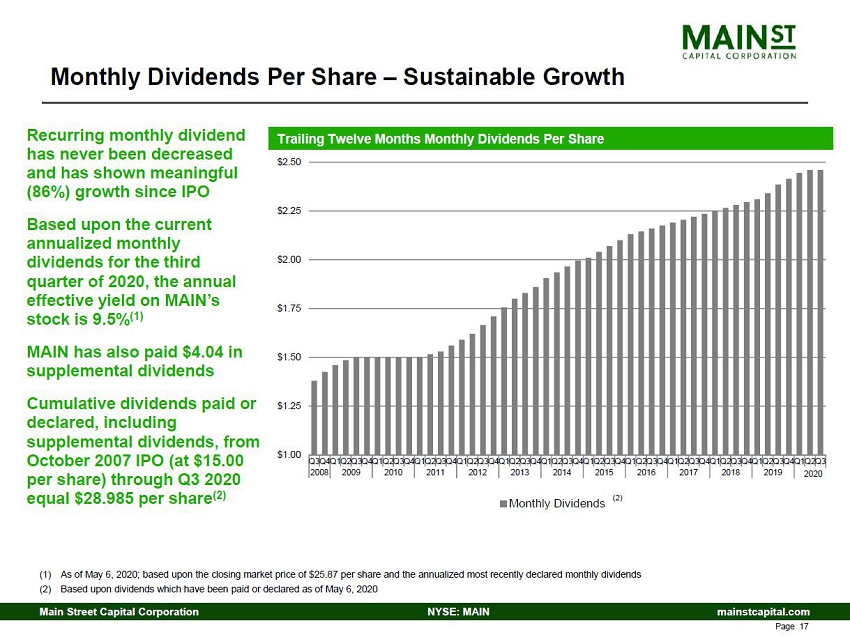 mainstcapital.com NYSE: MAIN Main Street Capital Corporation Page 16 MAIN Co - Founders and Executive Management Team (1) Member of MAIN Executive Committee (2) Member of MAIN Investment Committee (3) Chief Investment Officer (4) Chief Operating Officer (5) Chief Compliance Officer • Co - founded MAIN; Joined Main Street group in 2002; affiliated with Main Street group since 1999 • Director of acquisitions / integration with Quanta Services (NYSE: PWR) • Manager with a Big 5 Accounting Firm’s audit and transaction services groups Dwayne Hyzak; CPA (1)(2) CEO Brent Smith; CPA CFO and Treasurer • Joined MAIN in 2014 • Previously CFO with a publicly - traded oilfield services company • Prior experience with a Big 5 Accounting Firm and a publicly - traded financial consulting firm Jason Beauvais; JD SVP, GC, CCO (5) and Secretary • Joined MAIN in 2008 • Previously attorney for Occidental Petroleum Corporation (NYSE: OXY) and associate in the corporate and securities section at Baker Botts LLP David Magdol (1)(2) President and CIO (3 ) • Co - founded MAIN; Joined Main Street group in 2002 • Vice President in Lazard Freres Investment Banking Division • Vice President of McMullen Group (John J. McMullen’s Family Office) Jesse Morris; CPA COO (4) and Executive Vice President • Joined MAIN in 2019 • Previously Executive Vice President with Quanta Services (NYSE: PWR) • Prior experience with a Big 5 Accounting Firm and a publicly - traded foodservice distribution company • Co - founded MAIN and MAIN predecessor funds (1997) • Co - founded Quanta Services (NYSE: PWR) • Partner in charge of a Big 5 Accounting Firm’s Corporate Finance/Mergers and Acquisitions practice for the Southwest United States Vince Foster; CPA & JD (1)(2) Executive Chairman