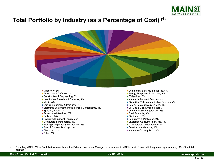 mainstcapital.com NYSE: MAIN Main Street Capital Corporation Page 19 MAIN (2) Internally Managed BDC’s (3)(5) Externally Managed BDC’s (4)(5) Long - term Maturity of Debt Obligations MAIN’s conservative capital structure provides long - term access to attractively - priced and structured debt facilities • Allows for investments in assets with long - term holding periods / illiquid positions and greater yields and overall returns • Provides downside protection and liquidity through economic cycles • Allows MAIN to be opportunistic during periods of economic uncertainty $277.0 $20.0 $40.0 $16.0 $63.8 $75.0 $75.0 $15.0 $185.0 $325.0 0 50 100 150 200 250 300 350 400 2020 2021 2022 2023 2024 2025 2026 2027 2028 2029 2030 (in millions) Credit Facility SBIC debentures 4.50% Notes due 2022 5.20% Notes due 2024 (1) (2) (1) Based upon outstanding balance as of March 31, 2020; total commitments at March 31 , 2020 were $740.0 million (2) Issued in November 2017; redeemable at MAIN’s option at any time, subject to certain make - whole provisions (3) Issued in April 2019 with a follow - on issuance in December 2019; redeemable at MAIN’s option at any time, subject to certain mak e - whole provisions (3)