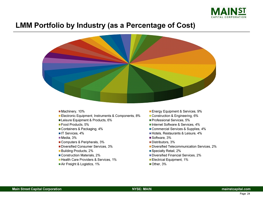 mainstcapital.com NYSE: MAIN Main Street Capital Corporation Page 23 LMM Investment Portfolio Median LMM portfolio credit statistics: • Senior leverage of 2 .6 x EBITDA through MAIN debt position • 3.0x EBITDA to senior interest coverage • Total leverage of 2.6x EBITDA including debt junior in priority to MAIN • Free cash flow de - leveraging improves credit metrics and increases equity appreciation Average investment size of $16.7 million at fair value or $14.2 million on a cost basis (less than 1% of total investment portfolio) Opportunistic, selective posture toward new investment activity over the economic cycle High quality, seasoned LMM portfolio • Total LMM portfolio investments at fair value equals 118 % of cost • Equity component of LMM portfolio at fair value equals 162% of cost • Significant portion of LMM portfolio has de - leveraged and a majority of the LMM portfolio investments have experienced equity appreciation LMM Investment Portfolio is a pool of high quality, seasoned assets with attractive risk - adjusted return characteristics