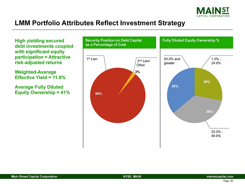 mainstcapital.com NYSE: MAIN Main Street Capital Corporation Page 25 Acquisition LBO/MBO Growth Capital Recapitalization/ Refinancing Diversified LMM Portfolio (as a Percentage of Cost) Invested Capital by Geography (1) 25% 20% 34% 11% 10% Invested Capital by Transaction Type (1) Based upon portfolio company headquarters 2% 40% 51% 7%