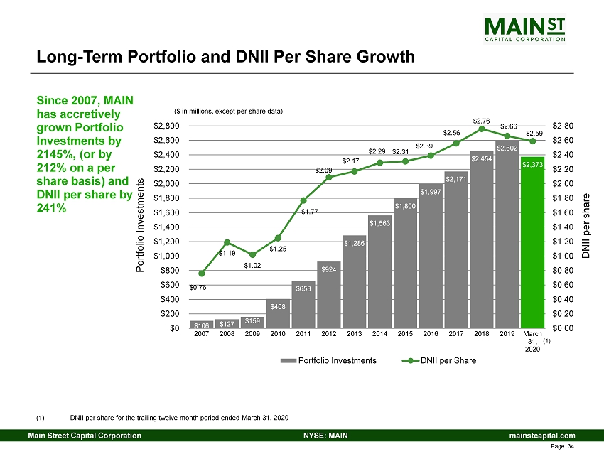 mainstcapital.com NYSE: MAIN Main Street Capital Corporation Page 33 MAIN Financial Performance Total Investment Income ($ in millions) $164.6 $178.3 $205.7 $233.4 $243.4 $56.2 2015 2016 2017 2018 2019 YTD 2020 $0.0 $20.0 $40.0 $60.0 $80.0 $100.0 $120.0 $140.0 $160.0 $180.0 $200.0 $220.0 $240.0 $260.0 (2) 4% Distributable Net Investment Income ($ in millions) $113.3 $124.1 $145.4 $165.8 $167.4 $39.4 2015 2016 2017 2018 2019 YTD 2020 $0.0 $20.0 $40.0 $60.0 $80.0 $100.0 $120.0 $140.0 $160.0 $180.0 (2) Year over Year Growth Year over Year Growth 10% 8% 17% 13% 14% 15% (6)% (1) (8)% (1) 1% (1) Reflects year - to - date March 31, 2020 performance compared with year - to - date March 31, 2019 performance (2) Through March 31, 2020