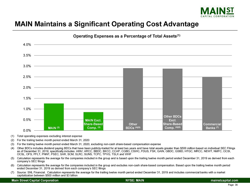 mainstcapital.com NYSE: MAIN Main Street Capital Corporation Page 35 Efficient and Leverageable Operating Structure “Internally managed” structure means no external management fees or expenses are paid Alignment of interest between management and investors • Greater incentives to maximize increases to shareholder value and rationalize debt and equity capital raises • 100% of MAIN’s management efforts and activities are for the benefit of the BDC MAIN targets total operating expenses (1) as a percentage of average assets (Operating Expense to Assets Ratio) at or less than 2% • Long - term actual results have significantly outperformed target • Industry leading Operating Expense to Assets Ratio of 1.3% (2) Significant portion of total operating expenses (1) are non - cash • Non - cash expense for restricted stock amortization was 32.1% (2) of total operating expenses (1) • Operating Expense to Assets Ratio of 0.9% (2) excluding non - cash restricted stock amortization expense MAIN’s internally managed operating structure provides significant operating leverage and greater returns for our shareholders (1) Total operating expenses, including non - cash share based compensation expense and excluding interest expense (2) Based upon the trailing twelve month period ended March 31, 2020