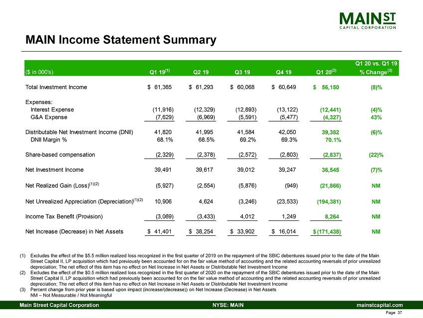 mainstcapital.com NYSE: MAIN Main Street Capital Corporation Page 36 MAIN Maintains a Significant Operating Cost Advantage (1) Total operating expenses excluding interest expense (2) For the trailing twelve month period ended March 31, 2020 (3) For the trailing twelve month period ended March 31, 2020, excluding non - cash share - based compensation expense (4) Other BDCs includes dividend paying BDCs that have been publicly - traded for at least two years and have total assets greater tha n $500 million based on individual SEC Filings as of December 31, 2019; specifically includes: AINV, ARCC, BBDC, BKCC, CCAP, CGBD, CSWC, FDUS, FSK, GAIN, GBDC, GSBD, HTGC, MRC C, NEWT, NMFC, OCSI, OCSL, OFS, PFLT, PNNT, PSEC, SAR, SCM, SLRC, SUNS, TCPC, TPVG, TSLX and WHF (5) Calculation represents the average for the companies included in the group and is based upon the trailing twelve month period en ded December 31, 2019 as derived from each company’s SEC filings (6) Calculation represents the average for the companies included in the group and excludes non - cash share - based compensation. Based upon the trailing twelve month period ended December 31, 2019 as derived from each company’s SEC filings (7) Source: SNL Financial. Calculation represents the average for the trailing twelve month period ended December 31, 2019 and includes commercial banks with a market capitalization between $500 million and $3 billion 0.0% 0.5% 1.0% 1.5% 2.0% 2.5% 3.0% 3.5% 4.0% MAIN (2) Other BDCs (4)(5) Commercial Banks (7) Operating Expenses as a Percentage of Total Assets (1) MAIN Excl. Share - Based Comp. (3) Other BDCs Excl. Share - Based Comp. (4)(6)