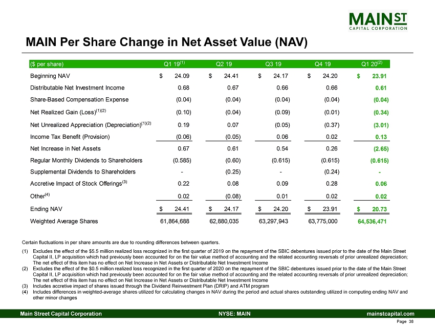 mainstcapital.com NYSE: MAIN Main Street Capital Corporation Page 37 MAIN Income Statement Summary (1) Excludes the effect of the $5.5 million realized loss recognized in the first quarter of 2019 on the repayment of the SBIC de ben tures issued prior to the date of the Main Street Capital II, LP acquisition which had previously been accounted for on the fair value method of accounting and the rela ted accounting reversals of prior unrealized depreciation; The net effect of this item has no effect on Net Increase in Net Assets or Distributable Net Investment Income (2) Excludes the effect of the $0.5 million realized loss recognized in the first quarter of 2020 on the repayment of the SBIC de ben tures issued prior to the date of the Main Street Capital II, LP acquisition which had previously been accounted for on the fair value method of accounting and the rela ted accounting reversals of prior unrealized depreciation; The net effect of this item has no effect on Net Increase in Net Assets or Distributable Net Investment Income (3) Percent change from prior year is based upon impact (increase/(decrease)) on Net Increase (Decrease) in Net Assets NM – Not Measurable / Not Meaningful Q1 20 vs. Q1 19 ($ in 000's) Q1 19 (1) Q2 19 Q3 19 Q4 19 Q1 20 (2) % Change (3) Total Investment Income 61,365$ 61,293$ 60,068$ 60,649$ 56,150$ (8)% Expenses: Interest Expense (11,916) (12,329) (12,893) (13,122) (12,441) (4)% G&A Expense (7,629) (6,969) (5,591) (5,477) (4,327) 43% Distributable Net Investment Income (DNII) 41,820 41,995 41,584 42,050 39,382 (6)% DNII Margin % 68.1% 68.5% 69.2% 69.3% 70.1% Share-based compensation (2,329) (2,378) (2,572) (2,803) (2,837) (22)% Net Investment Income 39,491 39,617 39,012 39,247 36,545 (7)% Net Realized Gain (Loss) (1)(2) (5,927) (2,554) (5,876) (949) (21,866) NM Net Unrealized Appreciation (Depreciation) (1)(2) 10,906 4,624 (3,246) (23,533) (194,381) NM Income Tax Benefit (Provision) (3,069) (3,433) 4,012 1,249 8,264 NM Net Increase (Decrease) in Net Assets 41,401$ 38,254$ 33,902$ 16,014$ (171,438)$ NM