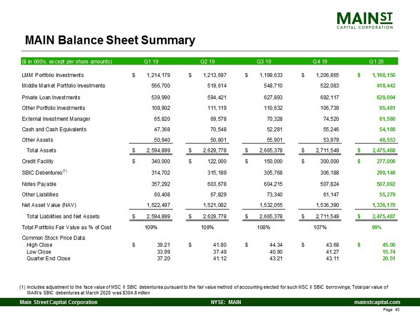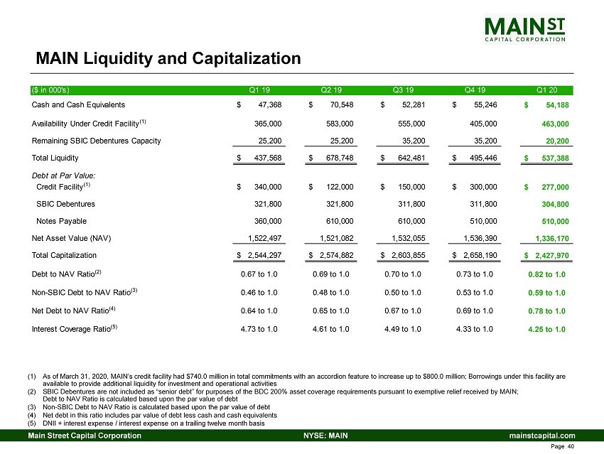 mainstcapital.com NYSE: MAIN Main Street Capital Corporation Page 39 MAIN Balance Sheet Summary (1) Includes adjustment to the face value of MSC II SBIC debentures pursuant to the fair value method of accounting elected for such MSC II SBIC borrowings; Total par value of MAIN’s SBIC debentures at March 2020 was $304.8 million ($ in 000's, except per share amounts) Q1 19 Q2 19 Q3 19 Q4 19 Q1 20 LMM Portfolio Investments 1,214,179$ 1,213,697$ 1,199,633$ 1,206,865$ 1,168,150$ Middle Market Portfolio Investments 566,700 519,614 548,710 522,083 418,442 Private Loan Investments 539,990 594,421 627,893 692,117 629,094 Other Portfolio Investments 109,902 111,119 110,632 106,739 95,481 External Investment Manager 65,820 69,578 70,328 74,520 61,580 Cash and Cash Equivalents 47,368 70,548 52,281 55,246 54,188 Other Assets 50,940 50,801 55,901 53,979 48,553 Total Assets 2,594,899$ 2,629,778$ 2,665,378$ 2,711,549$ 2,475,488$ Credit Facility 340,000$ 122,000$ 150,000$ 300,000$ 277,000$ SBIC Debentures (1) 314,702 315,189 305,768 306,188 299,146 Notes Payable 357,292 603,678 604,215 507,824 507,892 Other Liabilities 60,408 67,829 73,340 61,147 55,279 Net Asset Value (NAV) 1,522,497 1,521,082 1,532,055 1,536,390 1,336,170 Total Liabilities and Net Assets 2,594,899$ 2,629,778$ 2,665,378$ 2,711,549$ 2,475,487$ Total Portfolio Fair Value as % of Cost 109% 109% 108% 107% 99% Common Stock Price Data: High Close 39.21$ 41.80$ 44.34$ 43.68$ 45.00$ Low Close 33.99 37.49 40.90 41.27 15.74 Quarter End Close 37.20 41.12 43.21 43.11 20.51