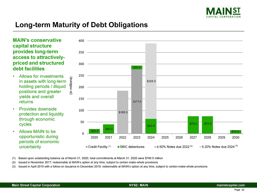 mainstcapital.com NYSE: MAIN Main Street Capital Corporation Page 41 Stable, Long - Term Leverage – Significant Unused Capacity MAIN maintains a conservative capital structure, with limited overall leverage and low cost, long - term debt Capital structure is designed to match expected duration and fixed/floating rate nature of investment portfolio assets (1) As of March 31 , 2020 MAIN’s credit facility had $740.0 million in total commitments from 18 relationship banks, with an accordion feature w hic h could increase total commitments up to $800.0 million (2) Revolver rate reflects the rate based on LIBOR effective as of the contractual reset date as of April 1, 2020 Facility Interest Rate Maturity Principal Drawn $740.0 million Credit Facility (1) L+1.875% floating (3.5% (2) ) September 2023 (fully revolving until maturity) $277.0 million Notes Payable 4.5% fixed Redeemable at MAIN's option at any time, subject to certain make whole provisions; Matures December 1, 2022 $185.0 million Notes Payable 5.2% fixed Redeemable at MAIN's option at any time, subject to certain make whole provisions; Matures May 1, 2024 $325.0 million SBIC Debentures 3.5% fixed (weighted average) Various dates between 2020 - 2030 (weighted average duration = 5.4 years) $304.8 million