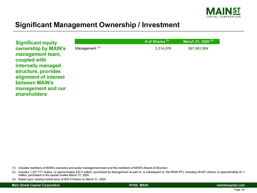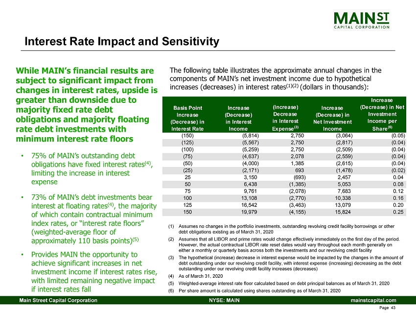 mainstcapital.com NYSE: MAIN Main Street Capital Corporation Page 43 Interest Rate Impact and Sensitivity The following table illustrates the approximate annual changes in the components of MAIN’s net investment income due to hypothetical increases (decreases) in interest rates (1)(2) (dollars in thousands): While MAIN’s financial results are subject to significant impact from changes in interest rates, upside is greater than downside due to majority fixed rate debt obligations and majority floating rate debt investments with minimum interest rate floors • 75% of MAIN’s outstanding debt obligations have fixed interest rates (4) , limiting the increase in interest expense • 73% of MAIN’s debt investments bear interest at floating rates (4) , the majority of which contain contractual minimum index rates, or “interest rate floors” (weighted - average floor of approximately 110 basis points) (5) • Provides MAIN the opportunity to achieve significant increases in net investment income if interest rates rise, with limited remaining negative impact if interest rates fall (1) Assumes no changes in the portfolio investments, outstanding revolving credit facility borrowings or other debt obligations existing as of March 31, 2020 (2) Assumes that all LIBOR and prime rates would change effectively immediately on the first day of the period. However, the actual contractual LIBOR rate reset dates would vary throughout each month generally on either a monthly or quarterly basis across both the investments and our revolving credit facility (3) The hypothetical (increase) decrease in interest expense would be impacted by the changes in the amount of debt outstanding under our revolving credit facility, with interest expense (increasing) decreasing as the debt outstanding under our revolving credit facility increases (decreases) (4) As of March 31, 2020 (5) Weighted - average interest rate floor calculated based on debt principal balances as of March 31, 2020 (6) Per share amount is calculated using shares outstanding as of March 31, 2020 Basis Point Increase (Decrease) in Interest Rate Increase (Decrease) in Interest Income (Increase) Decrease in Interest Expense (3) Increase (Decrease) in Net Investment Income Increase (Decrease) in Net Investment Income per Share (6) (150) (5,814) 2,750 (3,064) (0.05) (125) (5,567) 2,750 (2,817) (0.04) (100) (5,259) 2,750 (2,509) (0.04) (75) (4,637) 2,078 (2,559) (0.04) (50) (4,000) 1,385 (2,615) (0.04) (25) (2,171) 693 (1,478) (0.02) 25 3,150 (693) 2,457 0.04 50 6,438 (1,385) 5,053 0.08 75 9,761 (2,078) 7,683 0.12 100 13,108 (2,770) 10,338 0.16 125 16,542 (3,463) 13,079 0.20 150 19,979 (4,155) 15,824 0.25