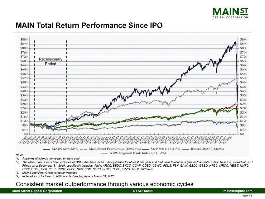 mainstcapital.com NYSE: MAIN Main Street Capital Corporation Page 44 March 31, 2020 (3) Management (1) 3,314,576 $67,981,954 # of Shares (2) Significant Management Ownership / Investment Significant equity ownership by MAIN’s management team, coupled with internally managed structure, provides alignment of interest between MAIN’s management and our shareholders (1) Includes members of MAIN’s executive and senior management team and the members of MAIN’s Board of Directors (2) Includes 1,227,777 shares, or approximately $32.2 million, purchased by Management as part of, or subsequent to, the MAIN IPO , i ncluding 28,627 shares, or approximately $1.1 million, purchased in the quarter ended March 31, 2020 (3) Based upon closing market price of $20.51/share on March 31, 2020