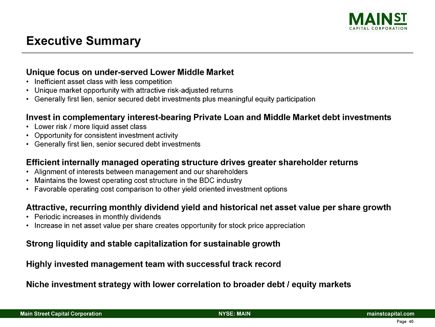 mainstcapital.com NYSE: MAIN Main Street Capital Corporation Page 45 Notes: (1) Assumes dividends reinvested on date paid (2) The Main Street Peer Group includes all BDCs that have been publicly - traded for at least one year and that have total assets gre ater than $500 million based on individual SEC Filings as of December 31, 2019; specifically includes: AINV, ARCC, BBDC, BKCC, CCAP, CGBD, CSWC, FDUS, FSK, GAIN, GBDC, GSBD , H TGC, MRCC, NEWT, NMFC, OCSI, OCSL, OFS, PFLT, PNNT, PSEC, SAR, SCM, SLRC, SUNS, TCPC, TPVG, TSLX, and WHF. (3) Main Street Peer Group is equal weighted (4) Indexed as of October 5, 2007 and last trading date is March 31, 2020 Consistent market outperformance through various economic cycles MAIN Total Return Performance Since IPO Recessionary Period
