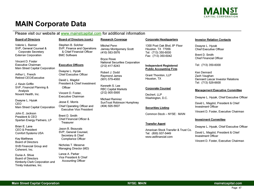 mainstcapital.com NYSE: MAIN Main Street Capital Corporation Page 47 MAIN Corporate Data Board of Directors Valerie L. Banner SVP, General Counsel & Corporate Secretary Exterran Corporation Vincent D. Foster Executive Chairman Main Street Capital Corporation Arthur L. French Retired CEO/Executive J. Kevin Griffin SVP, Financial Planning & Analysis Novant Health, Inc. Dwayne L. Hyzak CEO Main Street Capital Corporation John E. Jackson President & CEO Spartan Energy Partners, LP Brian E. Lane CEO & President Comfort Systems USA Kay Matthews Board of Directors SVB Financial Group and Coherent, Inc. Dunia A. Shive Board of Directors Kimberly - Clark Corporation and Trinity Industries, Inc. Board of Directors (cont.) Stephen B. Solcher SVP, Finance and Operations & Chief Financial Officer BMC Software Executive Officers Dwayne L. Hyzak Chief Executive Officer David L. Magdol President & Chief Investment Officer Vincent D. Foster, Executive Chairman Jesse E. Morris Chief Operating Officer and Executive Vice President Brent D. Smith Chief Financial Officer & Treasurer Jason B. Beauvais SVP, General Counsel, Secretary & Chief Compliance Officer Nicholas T. Meserve Managing Director (MD) Lance A. Parker Vice President & Chief Accounting Officer Research Coverage Mitchel Penn Janney Montgomery Scott (410) 583 - 5976 Bryce Rowe National Securities Corporation (212) 417 - 8243 Robert J. Dodd Raymond James (901) 579 - 4560 Kenneth S. Lee RBC Capital Markets (212) 905 - 5995 Michael Ramirez SunTrust Robinson Humphrey (404) 926 - 5607 Corporate Headquarters 1300 Post Oak Blvd, 8 th Floor Houston, TX 77056 Tel: (713) 350 - 6000 Fax: (713) 350 - 6042 Independent Registered Public Accounting Firm Grant Thornton, LLP Houston, TX Corporate Counsel Dechert, LLP Washington, D.C. Securities Listing Common Stock – NYSE: MAIN Transfer Agent American Stock Transfer & Trust Co. Tel: (800) 937 - 5449 www.astfinancial.com Investor Relation Contacts Dwayne L. Hyzak Chief Executive Officer Brent D. Smith Chief Financial Officer Tel: (713) 350 - 6000 Ken Dennard Zach Vaughan Dennard Lascar Investor Relations Tel: (713) 529 - 6600 Management Executive Committee Dwayne L. Hyzak, Chief Executive Officer David L. Magdol, President & Chief Investment Officer Vincent D. Foster, Executive Chairman Investment Committee Dwayne L. Hyzak, Chief Executive Officer David L. Magdol, President & Chief Investment Officer Vincent D. Foster, Executive Chairman Please visit our website at www.mainstcapital.com for additional information