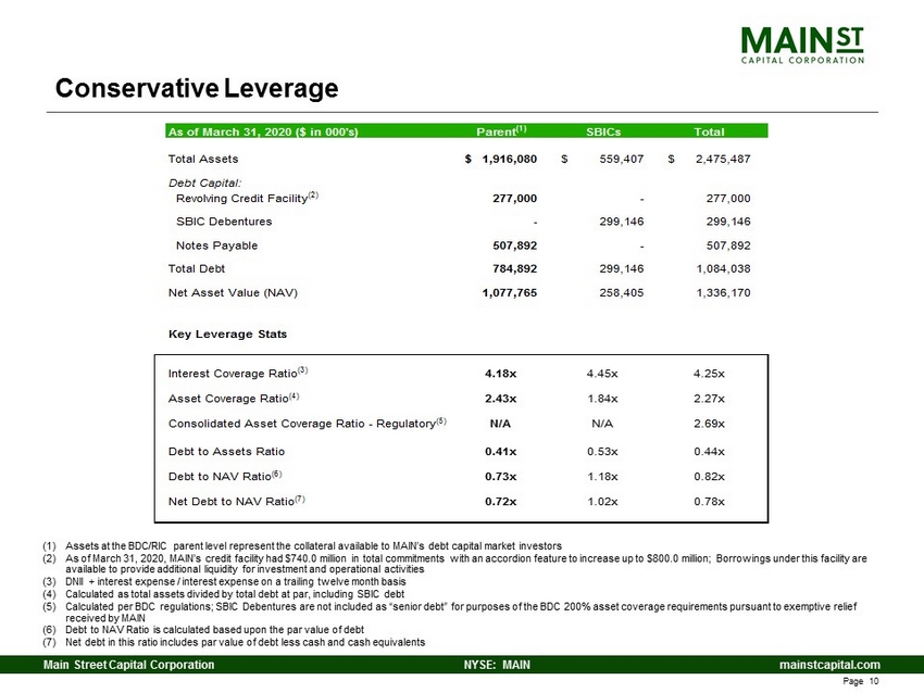 mainstcapital.com NYSE: MAIN Main Street Capital Corporation Page 9 MAIN Capital Structure (1) Debt amounts reflected at par value (2) Based on stock price of $20.51 as of March 31, 2020 Current capitalization ($ in 000's) March 31, 2020 % of Capitalization Cash 54,188$ Debt at parent Credit Facility 277,000 11.4% 5.20% Notes due 2024 (1) 325,000 13.4% 4.50% Notes due 2022 (1) 185,000 7.6% Total debt at parent 787,000 32.4% Debt at subsidiaries SBIC Debentures (1) 304,800 12.6% Total debt at subsidiaries 304,800 12.6% Total debt 1,091,800 45.0% Book value of equity 1,336,170 55.0% Total capitalization 2,427,970$ 100.0% Debt / Capitalization 0.45x Debt / Book equity 0.82x Debt / Enterprise value (2) 0.46x Debt / Market capitalization (2) 0.83x Stock price / Net asset value per share (2) 0.99x