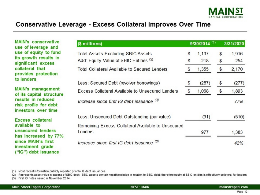 mainstcapital.com NYSE: MAIN Main Street Capital Corporation Page 11 Conservative Leverage - Regulatory Passage of the Small Business Credit Availability Act in December 2017 provides the opportunity for BDCs to obtain board or shareholder approval to access additional leverage by lowering the required asset coverage to 1.50x (from 2.00x) MAIN has historically operated at conservative regulatory leverage levels, in all cases with significant cushion to the historical (2.00x) regulatory limits, and proven through historical performance that MAIN does not require access to additional leverage to generate market leading returns (1) Calculated per BDC regulations; SBIC Debentures are not included as “senior debt” for purposes of the 200% Minimum Asset Cove rag e Ratio requirements pursuant to exemptive relief received by MAIN (2) Minimum required asset coverage of 2.00x prior to passage of the Small Business Credit Availability Act. Minimum requirement of 2.00x remains in place for all BDCs unless board or shareholder approval is obtained to lower minimum requirement to 1.50x MAIN's Historical Asset Coverage Ratio: 2015 2016 2017 2018 2019 Q1 20 Consolidated Asset Coverage Ratio - Regulatory (1) 2.92x 2.97x 3.67x 3.22x 2.89x 2.69x Minimum Required Asset Coverage (2) 2.00x 2.00x 2.00x 2.00x 2.00x 2.00x Cushion % above Miniumum Required Asset Coverage 46% 49% 84% 61% 45% 35%