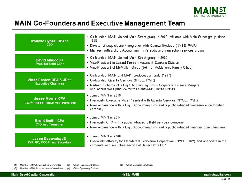 mainstcapital.com NYSE: MAIN Main Street Capital Corporation Page 13 Key Credit Highlights • Core executive management team has been together as a team for 15+ years • Extensive investment expertise and relationships • Significant management equity ownership • Meaningful operating cost advantage through efficient internally managed structure • Significant benefits through alignment of interests between management (stock ownership and incentive compensation) and investors • Industry leading operating expense efficiency • 1940 Act requires a minimum 2.0x regulatory asset coverage ratio (1) • MAIN’s asset coverage ratio is ~2.4x at the Parent level; ~2.7x on a regulatory basis • Conservative leverage position further enhanced through ongoing efficient capital raises through at - the - market, or ATM, equity issuance program Experienced Management Team with Strong Track Record Efficient and Leverageable Internally Managed Operating Structure Conservative Leverage Unique Investment Strategy • Unique investment strategy differentiates MAIN from its competitors and provides highly attractive risk - adjusted returns • Asset management advisory business significantly enhances MAIN’s returns to its investors High Quality Portfolio • Significant diversification • Debt investments primarily carry a first priority lien on the assets of the business • Permanent capital structure of BDC allows for long - term, patient investment strategy and overall approach (1) Minimum required asset coverage of 2.00x prior to passage of the Small Business Credit Availability Act; Minimum requirement of 2.00x remains in place unless Board or Shareholder approval is obtained to lower minimum requirement to 1.50x
