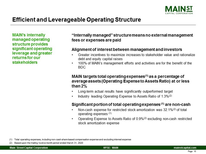 mainstcapital.com NYSE: MAIN Main Street Capital Corporation Page 15 March 31, 2020 (3) Management (1) 3,314,576 $67,981,954 # of Shares (2) Significant Management Ownership / Investment Significant equity ownership by MAIN’s management team, coupled with internally managed structure, provides alignment of interest between MAIN’s management and our stakeholders (1) Includes members of MAIN’s executive and senior management team and the members of MAIN’s Board of Directors (2) Includes 1,227,777 shares, or approximately $32.2 million, purchased by Management as part of, or subsequent to, the MAIN IPO , i ncluding 28,627 shares, or approximately $1.1 million, purchased in the quarter ended March 31, 2020 (3) Based upon closing market price of $20.51/share on March 31, 2020