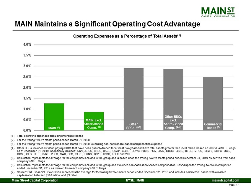 mainstcapital.com NYSE: MAIN Main Street Capital Corporation Page 16 Efficient and Leverageable Operating Structure “Internally managed” structure means no external management fees or expenses are paid Alignment of interest between management and investors • Greater incentives to maximize increases to stakeholder value and rationalize debt and equity capital raises • 100% of MAIN’s management efforts and activities are for the benefit of the BDC MAIN targets total operating expenses (1) as a percentage of average assets (Operating Expense to Assets Ratio) at or less than 2% • Long - term actual results have significantly outperformed target • Industry leading Operating Expense to Assets Ratio of 1.3% (2) Significant portion of total operating expenses (1) are non - cash • Non - cash expense for restricted stock amortization was 32.1% (2) of total operating expenses (1) • Operating Expense to Assets Ratio of 0.9% (2) excluding non - cash restricted stock amortization expense MAIN’s internally managed operating structure provides significant operating leverage and greater returns for our stakeholders (1) Total operating expenses, including non - cash share based compensation expense and excluding interest expense (2) Based upon the trailing twelve month period ended March 31, 2020
