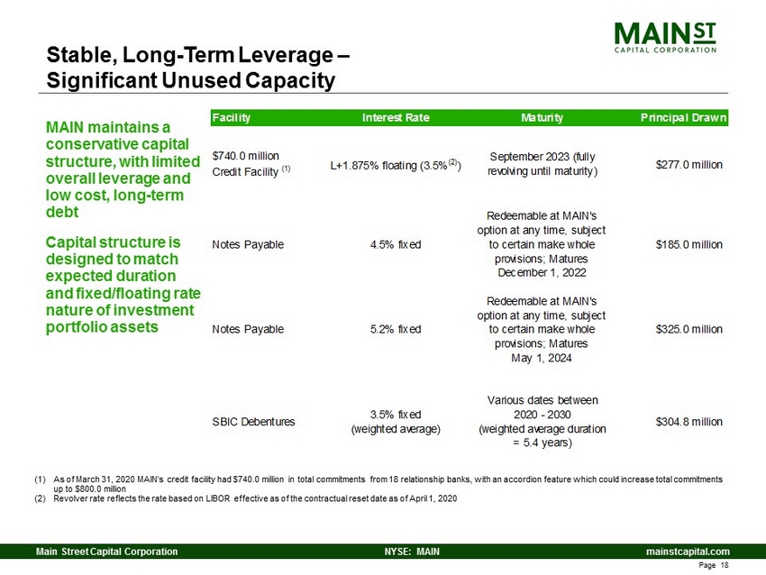 mainstcapital.com NYSE: MAIN Main Street Capital Corporation Page 17 MAIN Maintains a Significant Operating Cost Advantage (1) Total operating expenses excluding interest expense (2) For the trailing twelve month period ended March 31, 2020 (3) For the trailing twelve month period ended March 31, 2020, excluding non - cash share - based compensation expense (4) Other BDCs includes dividend paying BDCs that have been publicly - traded for at least two years and have total assets greater tha n $500 million based on individual SEC Filings as of December 31, 2019; specifically includes: AINV, ARCC, BBDC, BKCC, CCAP, CGBD, CSWC, FDUS, FSK, GAIN, GBDC, GSBD, HTGC, MRC C, NEWT, NMFC, OCSI, OCSL, OFS, PFLT, PNNT, PSEC, SAR, SCM, SLRC, SUNS, TCPC, TPVG, TSLX and WHF (5) Calculation represents the average for the companies included in the group and is based upon the trailing twelve month period en ded December 31, 2019 as derived from each company’s SEC filings (6) Calculation represents the average for the companies included in the group and excludes non - cash share - based compensation. Based upon the trailing twelve month period ended December 31, 2019 as derived from each company’s SEC filings (7) Source: SNL Financial. Calculation represents the average for the trailing twelve month period ended December 31, 2019 and includes commercial banks with a market capitalization between $500 million and $3 billion 0.0% 0.5% 1.0% 1.5% 2.0% 2.5% 3.0% 3.5% 4.0% MAIN (2) Other BDCs (4)(5) Commercial Banks (7) Operating Expenses as a Percentage of Total Assets (1) MAIN Excl. Share - Based Comp. (3) Other BDCs Excl. Share - Based Comp. (4)(6)