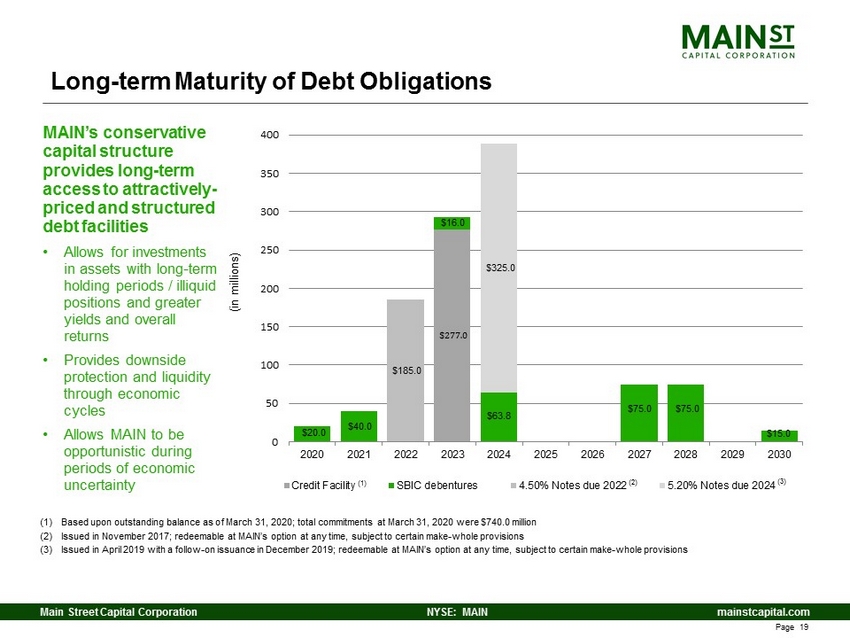 mainstcapital.com NYSE: MAIN Main Street Capital Corporation Page 18 Stable, Long - Term Leverage – Significant Unused Capacity MAIN maintains a conservative capital structure, with limited overall leverage and low cost, long - term debt Capital structure is designed to match expected duration and fixed/floating rate nature of investment portfolio assets (1) As of March 31 , 2020 MAIN’s credit facility had $740.0 million in total commitments from 18 relationship banks, with an accordion feature w hic h could increase total commitments up to $800.0 million (2) Revolver rate reflects the rate based on LIBOR effective as of the contractual reset date as of April 1, 2020 Facility Interest Rate Maturity Principal Drawn $740.0 million Credit Facility (1) L+1.875% floating (3.5% (2) ) September 2023 (fully revolving until maturity) $277.0 million Notes Payable 4.5% fixed Redeemable at MAIN's option at any time, subject to certain make whole provisions; Matures December 1, 2022 $185.0 million Notes Payable 5.2% fixed Redeemable at MAIN's option at any time, subject to certain make whole provisions; Matures May 1, 2024 $325.0 million SBIC Debentures 3.5% fixed (weighted average) Various dates between 2020 - 2030 (weighted average duration = 5.4 years) $304.8 million