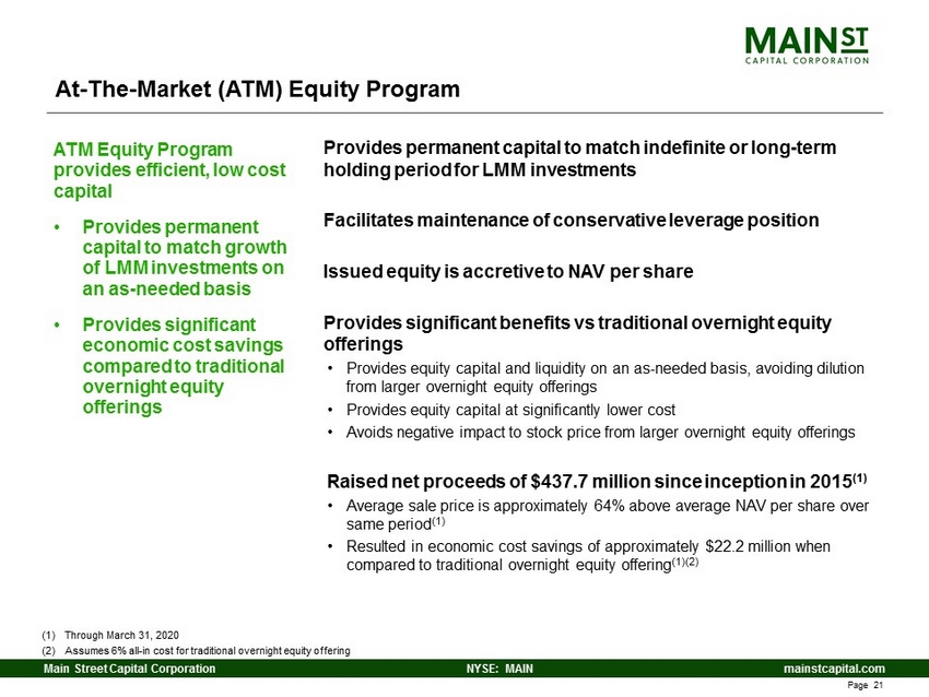 mainstcapital.com NYSE: MAIN Main Street Capital Corporation Page 20 Interest Rate Impact and Sensitivity The following table illustrates the approximate annual changes in the components of MAIN’s net investment income due to hypothetical increases (decreases) in interest rates (1)(2) (dollars in thousands): While MAIN’s financial results are subject to significant impact from changes in interest rates, upside is greater than downside due to majority fixed rate debt obligations and majority floating rate debt investments with minimum interest rate floors • 75% of MAIN’s outstanding debt obligations have fixed interest rates (4) , limiting the increase in interest expense • 73% of MAIN’s debt investments bear interest at floating rates (4) , the majority of which contain contractual minimum index rates, or “interest rate floors” (weighted - average floor of approximately 110 basis points) (5) • Provides MAIN the opportunity to achieve significant increases in net investment income if interest rates rise, with limited remaining negative impact if interest rates fall (1) Assumes no changes in the portfolio investments, outstanding revolving credit facility borrowings or other debt obligations existing as of March 31, 2020 (2) Assumes that all LIBOR and prime rates would change effectively immediately on the first day of the period. However, the actual contractual LIBOR rate reset dates would vary throughout each month generally on either a monthly or quarterly basis across both the investments and our revolving credit facility (3) The hypothetical (increase) decrease in interest expense would be impacted by the changes in the amount of debt outstanding under our revolving credit facility, with interest expense (increasing) decreasing as the debt outstanding under our revolving credit facility increases (decreases) (4) As of March 31, 2020 (5) Weighted - average interest rate floor calculated based on debt principal balances as of March 31, 2020 (6) Per share amount is calculated using shares outstanding as of March 31, 2020 Basis Point Increase (Decrease) in Interest Rate Increase (Decrease) in Interest Income (Increase) Decrease in Interest Expense (3) Increase (Decrease) in Net Investment Income Increase (Decrease) in Net Investment Income per Share (6) (150) (5,814) 2,750 (3,064) (0.05) (125) (5,567) 2,750 (2,817) (0.04) (100) (5,259) 2,750 (2,509) (0.04) (75) (4,637) 2,078 (2,559) (0.04) (50) (4,000) 1,385 (2,615) (0.04) (25) (2,171) 693 (1,478) (0.02) 25 3,150 (693) 2,457 0.04 50 6,438 (1,385) 5,053 0.08 75 9,761 (2,078) 7,683 0.12 100 13,108 (2,770) 10,338 0.16 125 16,542 (3,463) 13,079 0.20 150 19,979 (4,155) 15,824 0.25