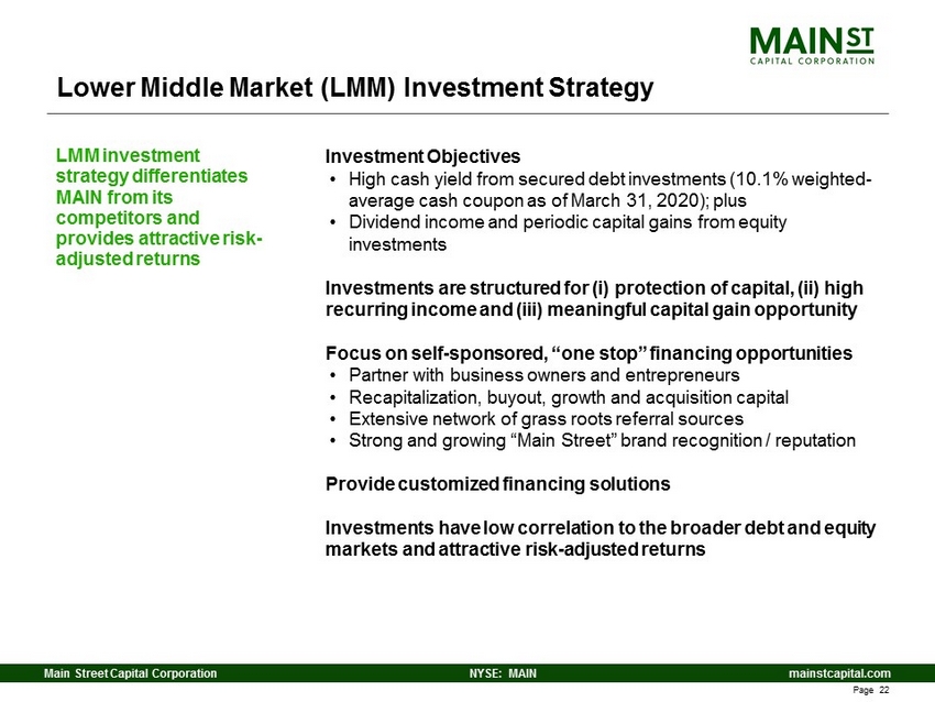 mainstcapital.com NYSE: MAIN Main Street Capital Corporation Page 21 At - The - Market (ATM) Equity Program Provides permanent capital to match indefinite or long - term holding period for LMM investments Facilitates maintenance of conservative leverage position Issued equity is accretive to NAV per share Provides significant benefits vs traditional overnight equity offerings • Provides equity capital and liquidity on an as - needed basis, avoiding dilution from larger overnight equity offerings • Provides equity capital at significantly lower cost • Avoids negative impact to stock price from larger overnight equity offerings Raised net proceeds of $437.7 million since inception in 2015 (1) • Average sale price is approximately 64% above average NAV per share over same period (1) • Resulted in economic cost savings of approximately $22.2 million when compared to traditional overnight equity offering (1)(2) ATM Equity Program provides efficient, low cost capital • Provides permanent capital to match growth of LMM investments on an as - needed basis • Provides significant economic cost savings compared to traditional overnight equity offerings (1) Through March 31, 2020 (2) Assumes 6% all - in cost for traditional overnight equity offering
