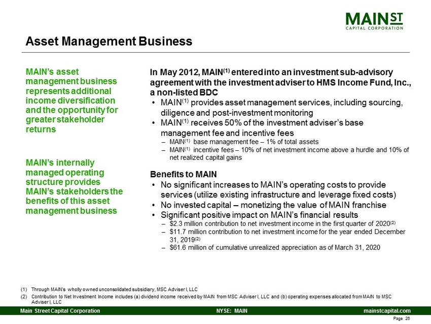 mainstcapital.com NYSE: MAIN Main Street Capital Corporation Page 25 Middle Market Debt Investment Strategy Investment Objective • Generate cash yield to support MAIN monthly dividend Investments in secured and/or rated debt investments • First lien, senior secured debt investments • Floating rate debt investments Larger companies than the LMM investment strategy • Current Middle Market portfolio companies have weighted - average EBITDA of approximately $80.6 million (1) Large and critical portion of U.S. economy • Nearly 200,000 domestic Middle Market businesses (2) More relative liquidity than LMM investments 6% – 10% targeted gross yields • Weighted - average effective yield (3) of 8 .1 % (4) • Net returns positively impacted by lower overhead requirements and modest use of leverage • Floating rate debt investments provide matching with MAIN’s floating rate credit facility MAIN maintains a portfolio of debt investments in Middle Market companies (1) This calculation excludes one Middle Market portfolio company as EBITDA is not a meaningful metric for this portfolio com pany (2) Source: National Center for The Middle Market; includes number of U.S. domestic businesses with revenues between $10 m ill ion and $1 billion (3) Weighted - average effective yield includes amortization of deferred debt origination fees and accretion of original issue discoun t, but excludes fees payable upon repayment of the debt instruments and any debt investments on non - accrual status (4) Weighted - average effective yield is calculated using the applicable floating interest rate as of March 31, 2020