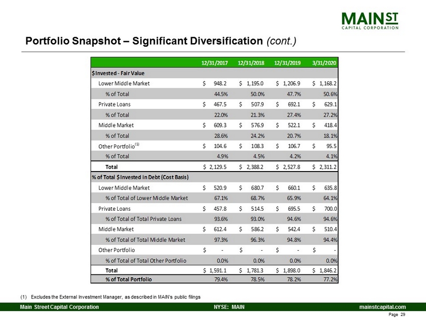 mainstcapital.com NYSE: MAIN Main Street Capital Corporation Page 28 Portfolio Snapshot – Significant Diversification (1) Excludes the External Investment Manager, as described in MAIN’s public filings 12/31/2017 12/31/2018 12/31/2019 3/31/2020 Number of Portfolio Companies Lower Middle Market 70 69 69 70 Private Loans 54 59 65 63 Middle Market 62 56 51 48 Other Portfolio (1) 11 11 11 11 Total 197 195 196 192 $ Invested - Cost Basis Lower Middle Market 776.5$ $ 990.9 $ 1,002.2 $ 991.5 % of Total 38.7% 43.7% 41.2% 41.4% Private Loans 489.2$ $ 553.3 $ 734.8 $ 740.1 % of Total 24.4% 24.4% 30.3% 31.0% Middle Market 629.7$ $ 608.8 $ 572.3 $ 540.8 % of Total 31.4% 26.8% 23.6% 22.6% Other Portfolio (1) 109.4$ $ 116.0 $ 118.4 $ 118.5 % of Total 5.5% 5.1% 4.9% 5.0% Total 2,004.8$ $ 2,269.0 $ 2,427.7 $ 2,390.9