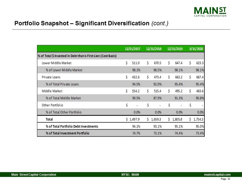 mainstcapital.com NYSE: MAIN Main Street Capital Corporation Page 29 Portfolio Snapshot – Significant Diversification (cont.) (1) Excludes the External Investment Manager, as described in MAIN’s public filings 12/31/2017 12/31/2018 12/31/2019 3/31/2020 $ Invested - Fair Value Lower Middle Market 948.2$ $ 1,195.0 $ 1,206.9 $ 1,168.2 % of Total 44.5% 50.0% 47.7% 50.6% Private Loans 467.5$ $ 507.9 $ 692.1 $ 629.1 % of Total 22.0% 21.3% 27.4% 27.2% Middle Market 609.3$ $ 576.9 $ 522.1 $ 418.4 % of Total 28.6% 24.2% 20.7% 18.1% Other Portfolio (1) 104.6$ $ 108.3 $ 106.7 $ 95.5 % of Total 4.9% 4.5% 4.2% 4.1% Total 2,129.5$ $ 2,388.2 $ 2,527.8 $ 2,311.2 % of Total $ Invested in Debt (Cost Basis) Lower Middle Market 520.9$ $ 680.7 $ 660.1 $ 635.8 % of Total of Lower Middle Market 67.1% 68.7% 65.9% 64.1% Private Loans 457.8$ $ 514.5 $ 695.5 $ 700.0 % of Total of Total Private Loans 93.6% 93.0% 94.6% 94.6% Middle Market 612.4$ $ 586.2 $ 542.4 $ 510.4 % of Total of Total Middle Market 97.3% 96.3% 94.8% 94.4% Other Portfolio -$ $ - $ - $ - % of Total of Total Other Portfolio 0.0% 0.0% 0.0% 0.0% Total 1,591.1$ $ 1,781.3 $ 1,898.0 $ 1,846.2 % of Total Portfolio 79.4% 78.5% 78.2% 77.2%