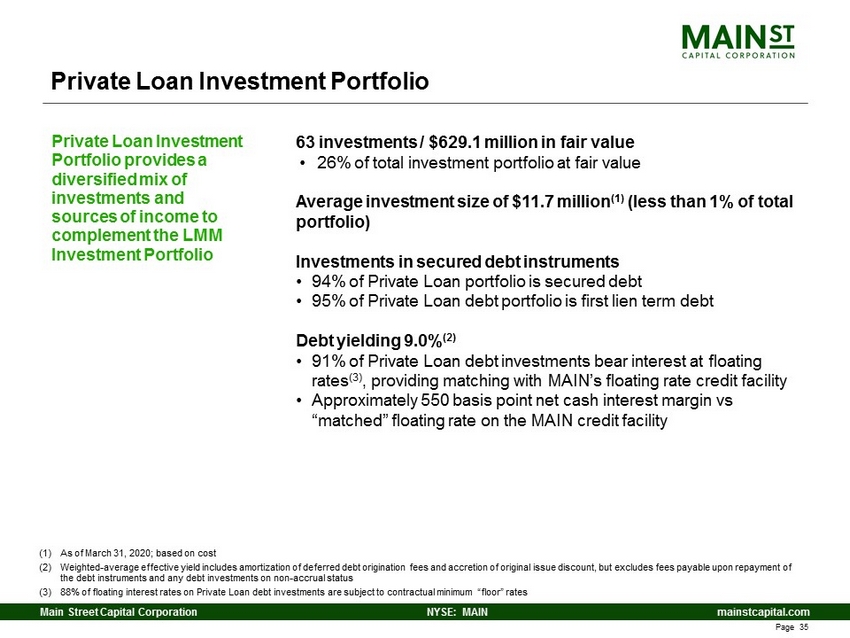 mainstcapital.com NYSE: MAIN Main Street Capital Corporation Page 34 $106 $127 $159 $408 $658 $924 $1,286 $1,563 $1,800 $1,997 $2,171 $2,454 $2,602 $2,373 $0.76 $1.19 $1.02 $1.25 $1.77 $2.09 $2.17 $2.29 $2.31 $2.39 $2.56 $2.76 $2.66 $2.59 $0.00 $0.20 $0.40 $0.60 $0.80 $1.00 $1.20 $1.40 $1.60 $1.80 $2.00 $2.20 $2.40 $2.60 $2.80 2007 2008 2009 2010 2011 2012 2013 2014 2015 2016 2017 2018 2019 March 31, 2020 $0 $200 $400 $600 $800 $1,000 $1,200 $1,400 $1,600 $1,800 $2,000 $2,200 $2,400 $2,600 $2,800 DNII per share Portfolio Investments Portfolio Investments DNII per Share (1) Long - Term Portfolio and DNII Per Share Growth Since 2007, MAIN has accretively grown Portfolio Investments by 2145%, (or by 212% on a per share basis) and DNII per share by 241% ($ in millions, except per share data) (1) DNII per share for the trailing twelve month period ended March 31, 2020