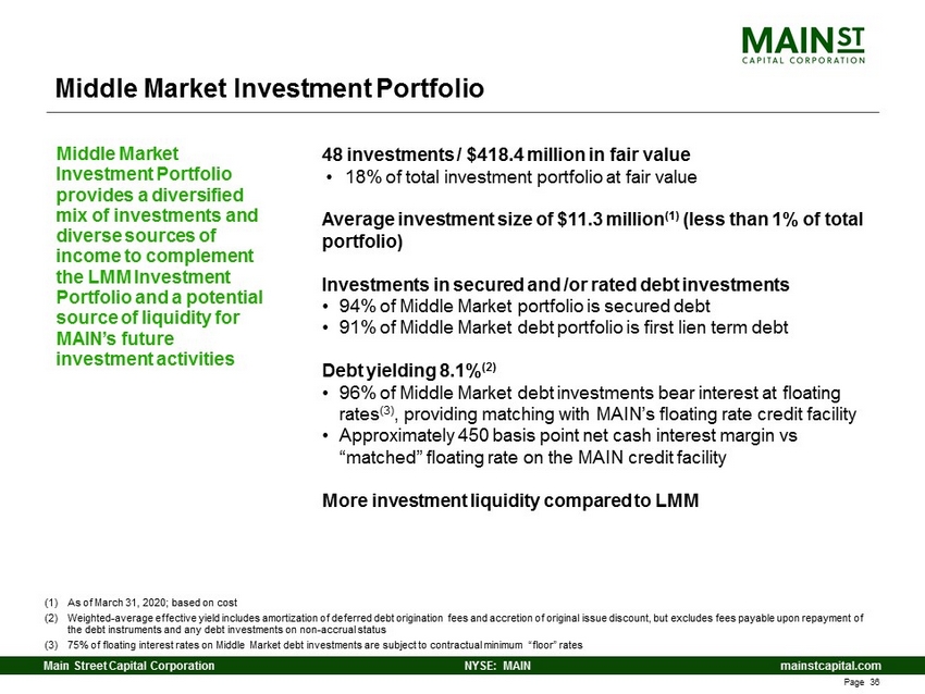 mainstcapital.com NYSE: MAIN Main Street Capital Corporation Page 35 Private Loan Investment Portfolio 63 investments / $629.1 million in fair value • 26% of total investment portfolio at fair value Average investment size of $11.7 million (1) (less than 1% of total portfolio) Investments in secured debt instruments • 94% of Private Loan portfolio is secured debt • 95% of Private Loan debt portfolio is first lien term debt Debt yielding 9.0% (2) • 91% of Private Loan debt investments bear interest at floating rates (3) , providing matching with MAIN’s floating rate credit facility • Approximately 550 basis point net cash interest margin vs “matched” floating rate on the MAIN credit facility Private Loan Investment Portfolio provides a diversified mix of investments and sources of income to complement the LMM Investment Portfolio (1) As of March 31, 2020; based on cost (2) Weighted - average effective yield includes amortization of deferred debt origination fees and accretion of original issue discoun t, but excludes fees payable upon repayment of the debt instruments and any debt investments on non - accrual status (3) 88% of floating interest rates on Private Loan debt investments are subject to contractual minimum “floor” rates
