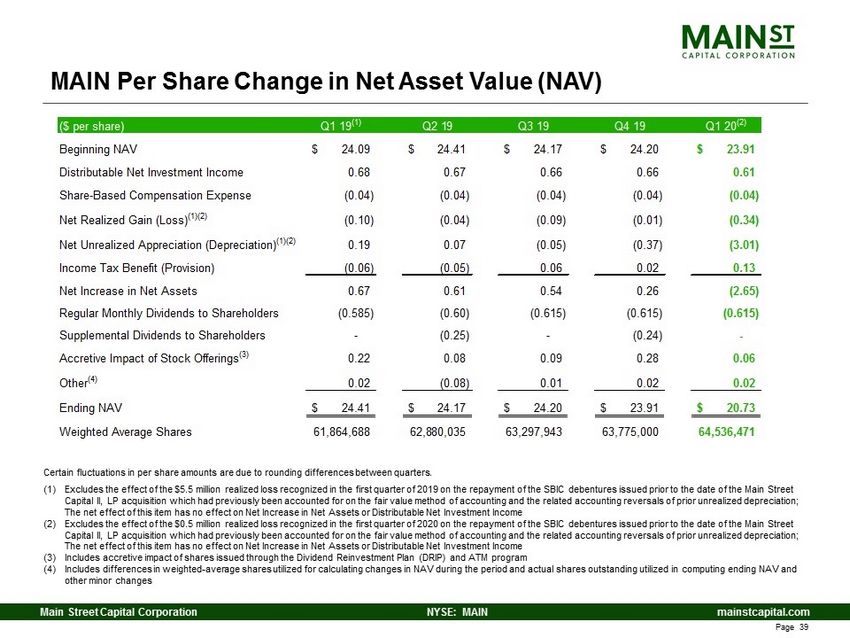 mainstcapital.com NYSE: MAIN Main Street Capital Corporation Page 38 MAIN Per Share Change in Net Asset Value (NAV) (1) Excludes the effect of the $5.5 million realized loss recognized in the first quarter of 2019 on the repayment of the SBIC de ben tures issued prior to the date of the Main Street Capital II, LP acquisition which had previously been accounted for on the fair value method of accounting and the related acc oun ting reversals of prior unrealized depreciation; The net effect of this item has no effect on Net Increase in Net Assets or Distributable Net Investment Income (2) Excludes the effect of the $0.5 million realized loss recognized in the first quarter of 2020 on the repayment of the SBIC de ben tures issued prior to the date of the Main Street Capital II, LP acquisition which had previously been accounted for on the fair value method of accounting and the related acc oun ting reversals of prior unrealized depreciation; The net effect of this item has no effect on Net Increase in Net Assets or Distributable Net Investment Income (3) Includes accretive impact of shares issued through the Dividend Reinvestment Plan (DRIP) and ATM program (4) Includes differences in weighted - average shares utilized for calculating changes in NAV during the period and actual shares outs tanding utilized in computing ending NAV and other minor changes Certain fluctuations in per share amounts are due to rounding differences between quarters. ($ per share) Q1 19 (1) Q2 19 Q3 19 Q4 19 Q1 20 (2) Beginning NAV 24.09$ 24.41$ 24.17$ 24.20$ 23.91$ Distributable Net Investment Income 0.68 0.67 0.66 0.66 0.61 Share-Based Compensation Expense (0.04) (0.04) (0.04) (0.04) (0.04) Net Realized Gain (Loss) (1)(2) (0.10) (0.04) (0.09) (0.01) (0.34) Net Unrealized Appreciation (Depreciation) (1)(2) 0.19 0.07 (0.05) (0.37) (3.01) Income Tax Benefit (Provision) (0.06) (0.05) 0.06 0.02 0.13 Net Increase in Net Assets 0.67 0.61 0.54 0.26 (2.65) Regular Monthly Dividends to Shareholders (0.585) (0.60) (0.615) (0.615) (0.615) Supplemental Dividends to Shareholders - (0.25) - (0.24) - Accretive Impact of Stock Offerings (3) 0.22 0.08 0.09 0.28 0.06 Other (4) 0.02 (0.08) 0.01 0.02 0.02 Ending NAV 24.41$ 24.17$ 24.20$ 23.91$ 20.73$ Weighted Average Shares 61,864,688 62,880,035 63,297,943 63,775,000 64,536,471