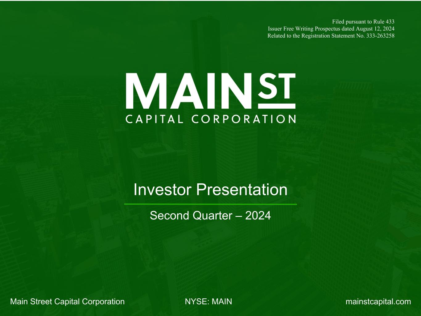 mainstcapital.comNYSE: MAINMain Street Capital Corporation www.mainstcapital.com Page 1 Investor Presentation Second Quarter – 2024 Main St et Capital Corporation NYSE: IN mainstc ital.com Filed pursuant to Rule 433 Issuer Free Writing Prospectus dated August 12, 2024 Related to the Registration Statement No. 333-263258