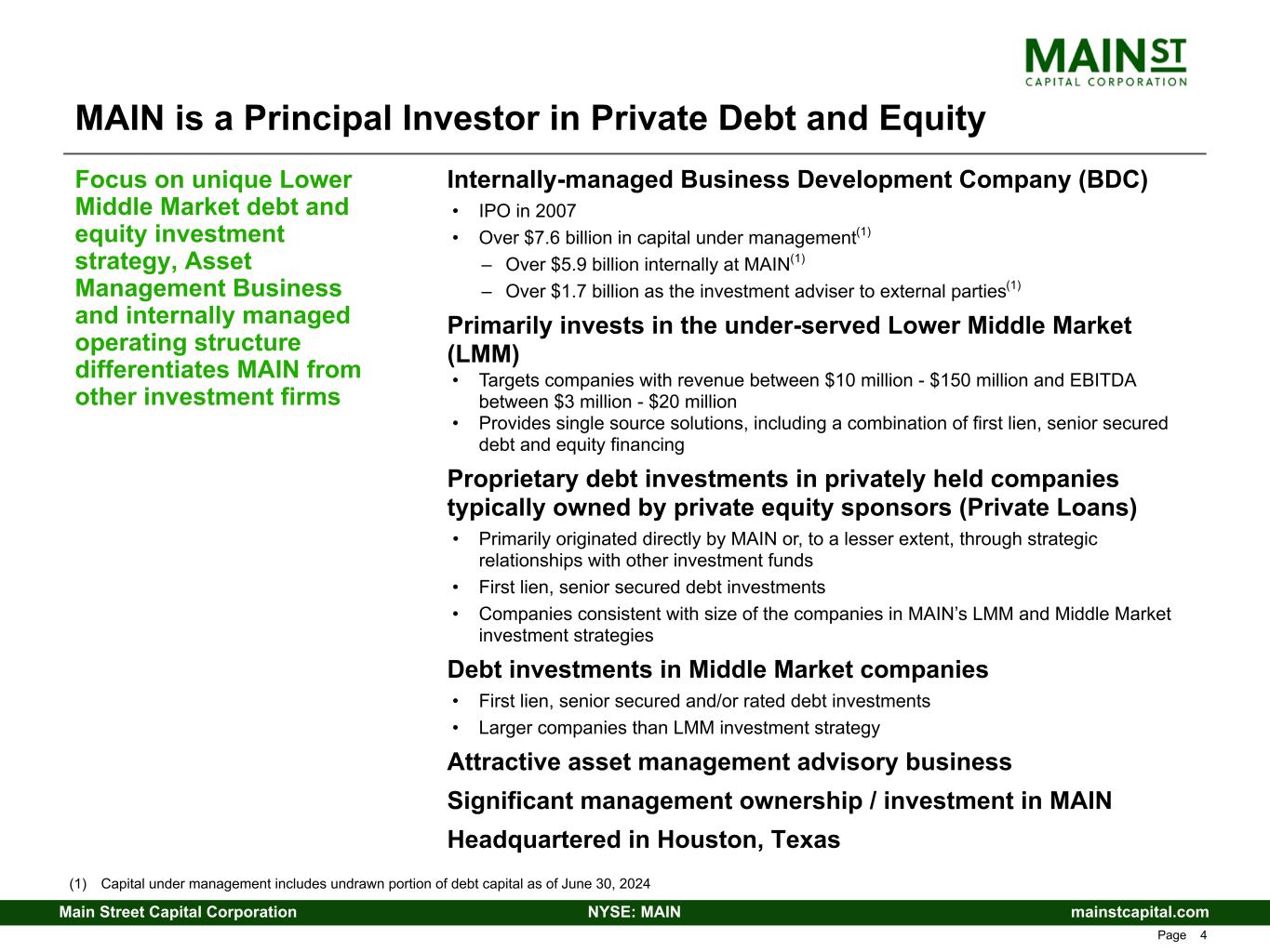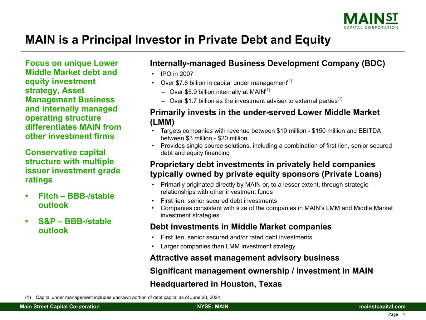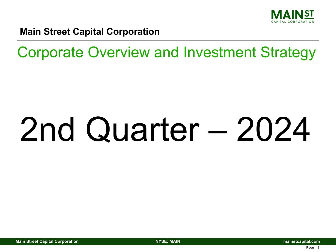 mainstcapital.comNYSE: MAINMain Street Capital Corporation www.mainstcapital.com Page 3 Main Street Capital Corporation Corporate Overview and Investment Strategy 2nd Quarter – 2024