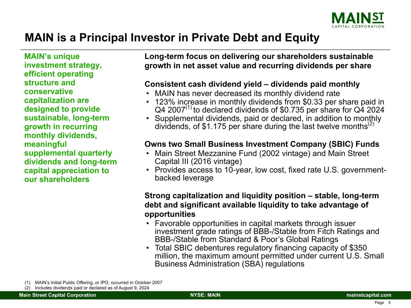 mainstcapital.comNYSE: MAINMain Street Capital Corporation www.mainstcapital.com Page 4 MAIN is a Principal Investor in Private Debt and Equity Focus on unique Lower Middle Market debt and equity investment strategy, Asset Management Business and internally managed operating structure differentiates MAIN from other investment firms Conservative capital structure with multiple issuer investment grade ratings • Fitch – BBB-/stable outlook • S&P – BBB-/stable outlook (1) Capital under management includes undrawn portion of debt capital as of June 30, 2024 Internally-managed Business Development Company (BDC) • IPO in 2007 • Over $7.6 billion in capital under management(1) – Over $5.9 billion internally at MAIN(1) – Over $1.7 billion as the investment adviser to external parties(1) Primarily invests in the under-served Lower Middle Market (LMM) • Targets companies with revenue between $10 million - $150 million and EBITDA between $3 million - $20 million • Provides single source solutions, including a combination of first lien, senior secured debt and equity financing Proprietary debt investments in privately held companies typically owned by private equity sponsors (Private Loans) • Primarily originated directly by MAIN or, to a lesser extent, through strategic relationships with other investment funds • First lien, senior secured debt investments • Companies consistent with size of the companies in MAIN’s LMM and Middle Market investment strategies Debt investments in Middle Market companies • First lien, senior secured and/or rated debt investments • Larger companies than LMM investment strategy Attractive asset management advisory business Significant management ownership / investment in MAIN Headquartered in Houston, Texas