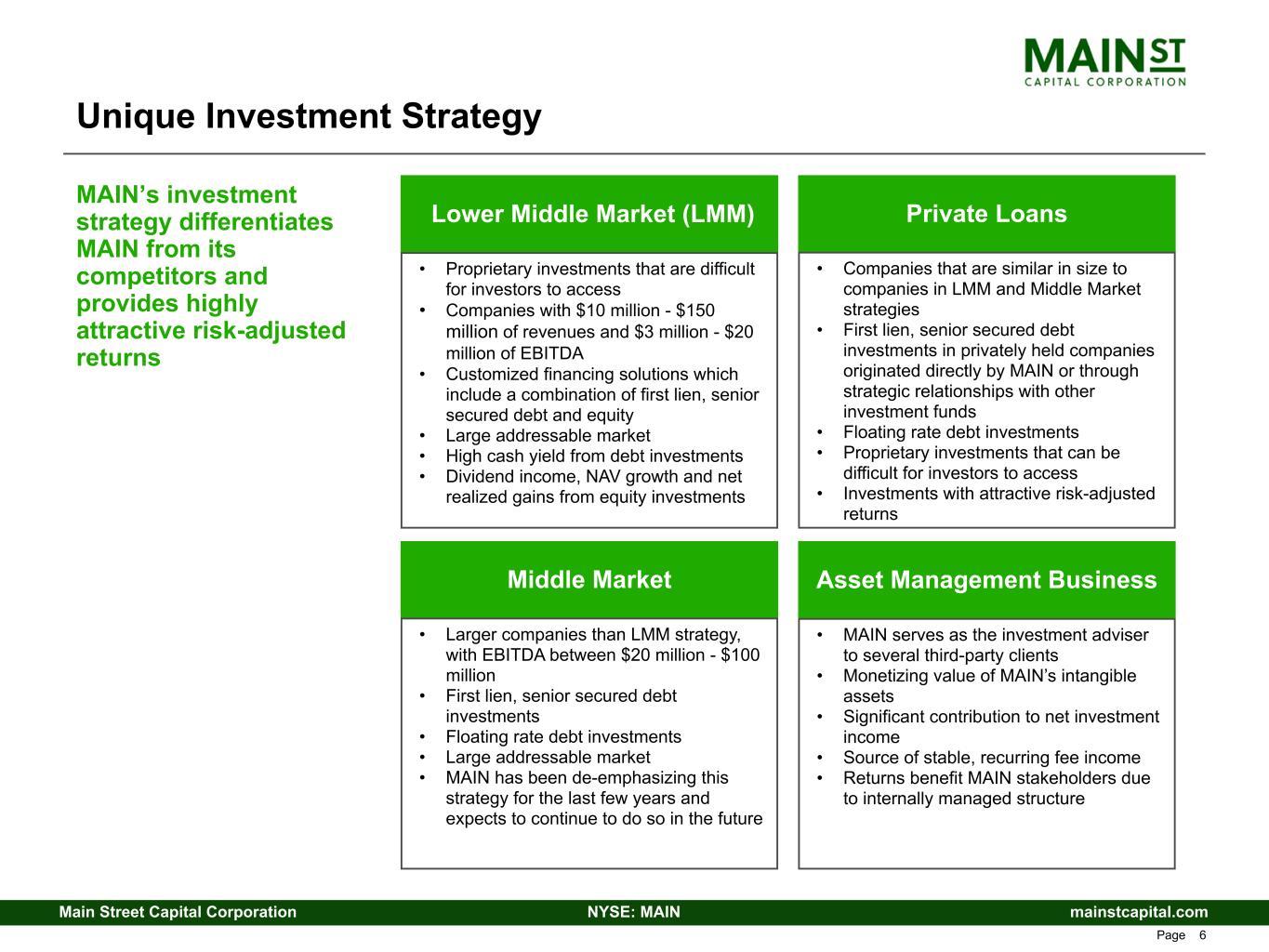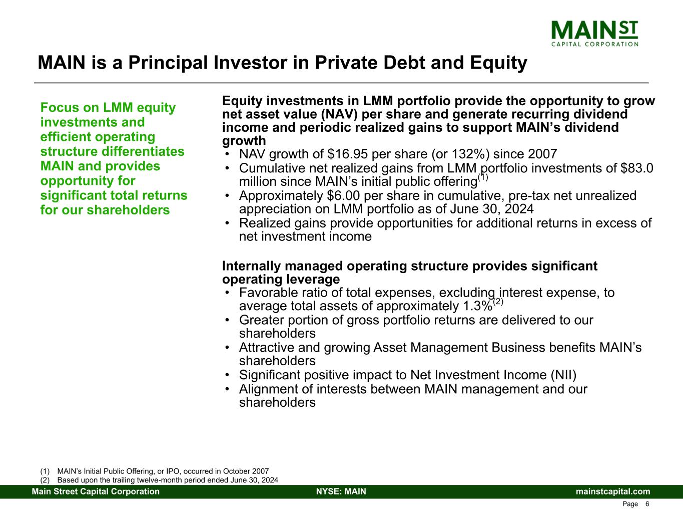 mainstcapital.comNYSE: MAINMain Street Capital Corporation www.mainstcapital.com Page 5 MAIN is a Principal Investor in Private Debt and Equity Long-term focus on delivering our shareholders sustainable growth in net asset value and recurring dividends per share Consistent cash dividend yield – dividends paid monthly • MAIN has never decreased its monthly dividend rate • 123% increase in monthly dividends from $0.33 per share paid in Q4 2007(1) to declared dividends of $0.735 per share for Q4 2024 • Supplemental dividends, paid or declared, in addition to monthly dividends, of $1.175 per share during the last twelve months(2) Owns two Small Business Investment Company (SBIC) Funds • Main Street Mezzanine Fund (2002 vintage) and Main Street Capital III (2016 vintage) • Provides access to 10-year, low cost, fixed rate U.S. government- backed leverage Strong capitalization and liquidity position – stable, long-term debt and significant available liquidity to take advantage of opportunities • Favorable opportunities in capital markets through issuer investment grade ratings of BBB-/Stable from Fitch Ratings and BBB-/Stable from Standard & Poor’s Global Ratings • Total SBIC debentures regulatory financing capacity of $350 million, the maximum amount permitted under current U.S. Small Business Administration (SBA) regulations MAIN’s unique investment strategy, efficient operating structure and conservative capitalization are designed to provide sustainable, long-term growth in recurring monthly dividends, meaningful supplemental quarterly dividends and long-term capital appreciation to our shareholders (1) MAIN’s Initial Public Offering, or IPO, occurred in October 2007 (2) Includes dividends paid or declared as of August 9, 2024