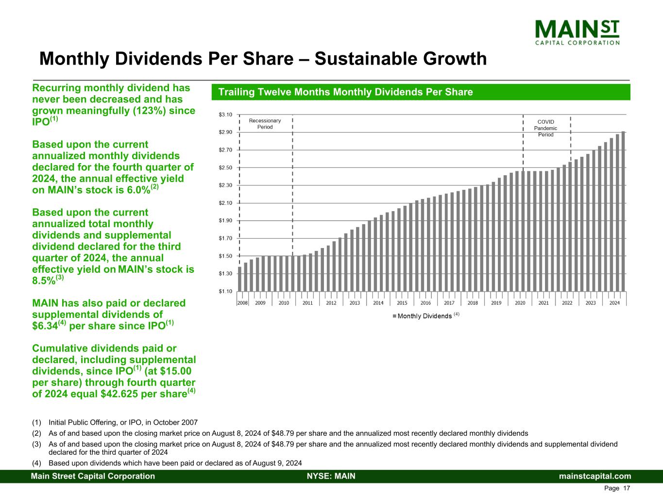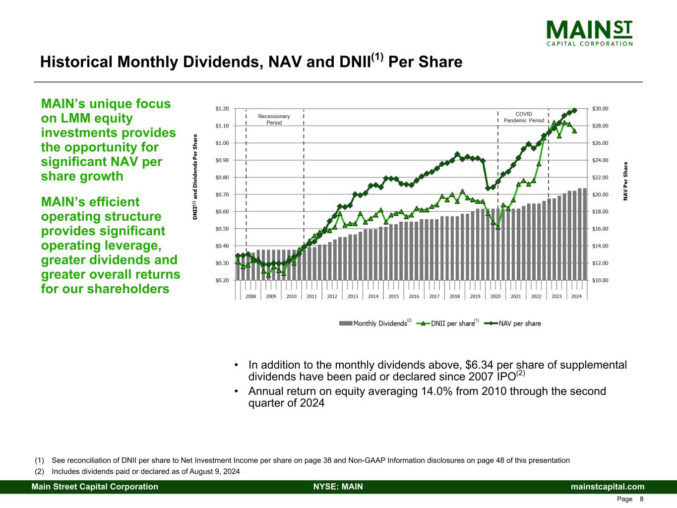 mainstcapital.comNYSE: MAINMain Street Capital Corporation www.mainstcapital.com Page 7 MAIN Strategy Produces Differentiated Returns Enhanced Value Proposition - Three Ways to Win are Better Than One 1. Sustain and Grow Dividends • Efficient operating structure provides operating leverage to grow Distributable Net Investment Income (DNII)(1), and dividends paid, as investment portfolio and total investment income grow • 123% increase in monthly dividends from $0.33 per share paid in Q4 2007(2) to declared dividends of $0.735 per share for Q4 2024 • Never decreased regular monthly dividends (including through 2008/2009 recession and 2020/2021 COVID-19 pandemic) • Paid or declared $42.625(3) per share in total dividends since IPO(2) at $15.00 per share ($36.285(3) per share in regular dividends and $6.34(3) per share in supplemental dividends) • Multi-faceted investment strategy supports growth of dividends over various cycles and markets 2. Meaningfully Grow Net Asset Value (NAV) Per Share • $12.85 as of December 31, 2007(2) to $29.80 as of June 30, 2024 – 132% growth; CAGR of 5.2% • Represents incremental economic return to investors beyond dividends • MAIN’s debt-focused peers (which comprises most BDCs) have not been able to generate NAV per share growth through the cycles • Unrealized appreciation is a good proxy for future dividend growth without the need for additional capital through growing portfolio dividend income and periodic harvesting of realized gains from equity investments • Ability to grow NAV per share provides opportunity for MAIN share price appreciation and additional shareholder returns 3. Supplement Growth in DNII(1) with Periodic Realized Gains • LMM equity component of investment strategy provides opportunity for meaningful realized gains (analogous to PIK income on debt investments from cash flow perspective, but more tax efficient and without cap on upside) • Realized gains validate the quality of MAIN’s unrealized appreciation on its LMM equity investments • Realized gains can be retained for future reinvestment due to MAIN’s unique tax structure or paid to shareholders as dividends (1) See reconciliation of DNII per share to Net Investment Income per share on page 38 and Non-GAAP Information disclosures on page 48 of this presentation (2) MAIN's Initial Public Offering, or IPO, occurred in October 2007 (3) Includes dividends paid or declared as of August 9, 2024