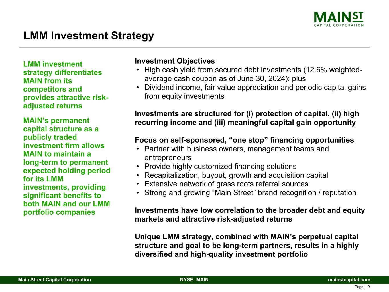 mainstcapital.comNYSE: MAINMain Street Capital Corporation www.mainstcapital.com Page 9 LMM Investment Strategy Investment Objectives • High cash yield from secured debt investments (12.6% weighted- average cash coupon as of June 30, 2024); plus • Dividend income, fair value appreciation and periodic capital gains from equity investments Investments are structured for (i) protection of capital, (ii) high recurring income and (iii) meaningful capital gain opportunity Focus on self-sponsored, “one stop” financing opportunities • Partner with business owners, management teams and entrepreneurs • Provide highly customized financing solutions • Recapitalization, buyout, growth and acquisition capital • Extensive network of grass roots referral sources • Strong and growing “Main Street” brand recognition / reputation Investments have low correlation to the broader debt and equity markets and attractive risk-adjusted returns Unique LMM strategy, combined with MAIN’s perpetual capital structure and goal to be long-term partners, results in a highly diversified and high-quality investment portfolio LMM investment strategy differentiates MAIN from its competitors and provides attractive risk- adjusted returns MAIN’s permanent capital structure as a publicly traded investment firm allows MAIN to maintain a long-term to permanent expected holding period for its LMM investments, providing significant benefits to both MAIN and our LMM portfolio companies