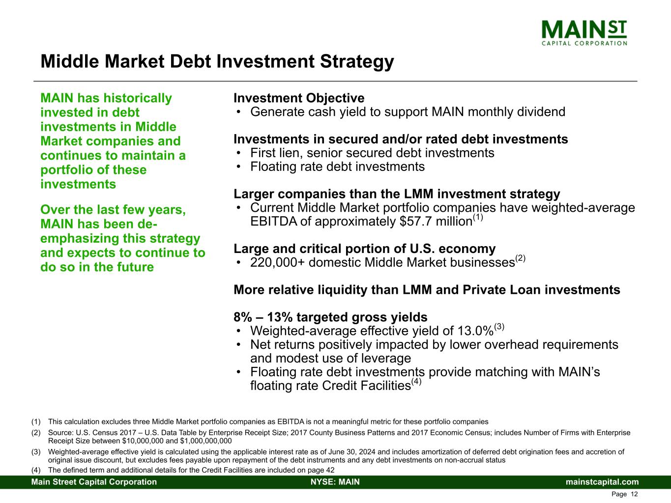 mainstcapital.comNYSE: MAINMain Street Capital Corporation www.mainstcapital.com Page 12 Middle Market Debt Investment Strategy Investment Objective • Generate cash yield to support MAIN monthly dividend Investments in secured and/or rated debt investments • First lien, senior secured debt investments • Floating rate debt investments Larger companies than the LMM investment strategy • Current Middle Market portfolio companies have weighted-average EBITDA of approximately $57.7 million(1) Large and critical portion of U.S. economy • 220,000+ domestic Middle Market businesses(2) More relative liquidity than LMM and Private Loan investments 8% – 13% targeted gross yields • Weighted-average effective yield of 13.0%(3) • Net returns positively impacted by lower overhead requirements and modest use of leverage • Floating rate debt investments provide matching with MAIN’s floating rate Credit Facilities(4) MAIN has historically invested in debt investments in Middle Market companies and continues to maintain a portfolio of these investments Over the last few years, MAIN has been de- emphasizing this strategy and expects to continue to do so in the future (1) This calculation excludes three Middle Market portfolio companies as EBITDA is not a meaningful metric for these portfolio companies (2) Source: U.S. Census 2017 – U.S. Data Table by Enterprise Receipt Size; 2017 County Business Patterns and 2017 Economic Census; includes Number of Firms with Enterprise Receipt Size between $10,000,000 and $1,000,000,000 (3) Weighted-average effective yield is calculated using the applicable interest rate as of June 30, 2024 and includes amortization of deferred debt origination fees and accretion of original issue discount, but excludes fees payable upon repayment of the debt instruments and any debt investments on non-accrual status (4) The defined term and additional details for the Credit Facilities are included on page 42