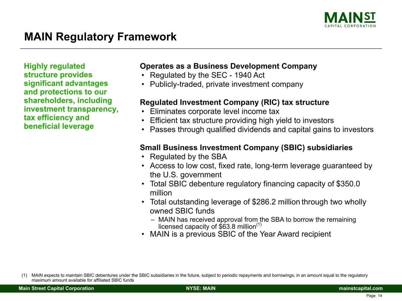 mainstcapital.comNYSE: MAINMain Street Capital Corporation www.mainstcapital.com Page 13 Key Credit Highlights • Management team has over 100 years of collective investment experience and relationships • Long-term working relationships together dating back over 20 years • Significant management equity ownership • Meaningful operating cost advantage through efficient internally managed structure • Significant benefits through alignment of interests between management (stock ownership and incentive compensation) and investors • Industry leading operating expense efficiency • 1940 Act requires MAIN to maintain a minimum 1.5x regulatory asset coverage ratio • MAIN’s asset coverage ratio is ~2.3x on a regulatory basis excluding SBIC Debentures; ~2.2x on a consolidated basis including SBIC debentures • Conservative leverage position further enhanced through ongoing efficient capital raises through at-the-market, or ATM, equity issuance program Experienced Management Team with Strong Track Record Efficient and Leverageable Internally Managed Operating Structure Conservative Leverage Unique Investment Strategy • Unique investment strategy differentiates MAIN from its competitors and provides highly attractive risk-adjusted returns • Asset management advisory business significantly enhances MAIN’s returns to its investors High Quality Portfolio • Significant diversification • Debt investments primarily carry a first priority lien on the assets of the business • Permanent capital structure of BDC allows for long-term, patient investment strategy and overall approach