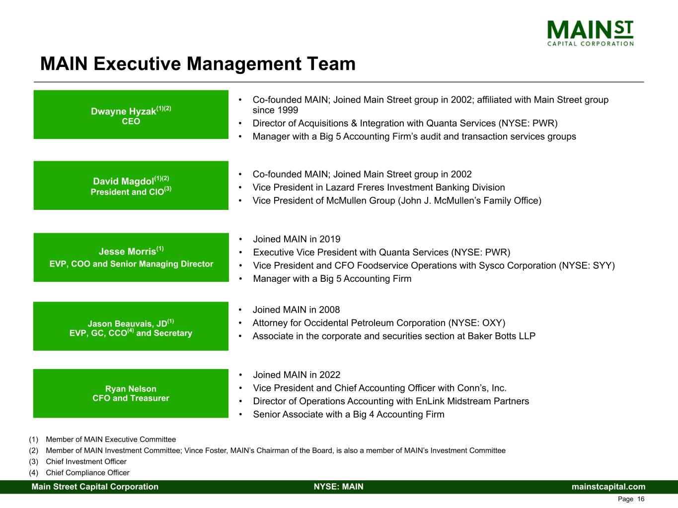 mainstcapital.comNYSE: MAINMain Street Capital Corporation www.mainstcapital.com Page 14 MAIN Executive Management Team (1) Member of MAIN Executive Committee (2) Member of MAIN Investment Committee; Vince Foster, MAIN’s Chairman of the Board, is also a member of MAIN’s Investment Committee (3) Chief Investment Officer (4) Chief Compliance Officer • Co-founded MAIN; Joined Main Street group in 2002; affiliated with Main Street group since 1999 • Director of Acquisitions & Integration with Quanta Services (NYSE: PWR) • Manager with a Big 5 Accounting Firm’s audit and transaction services groups Dwayne Hyzak(1)(2) CEO Jason Beauvais, JD(1) EVP, GC, CCO(4) and Secretary • Joined MAIN in 2008 • Attorney for Occidental Petroleum Corporation (NYSE: OXY) • Associate in the corporate and securities section at Baker Botts LLP David Magdol(1)(2) President and CIO(3) • Co-founded MAIN; Joined Main Street group in 2002 • Vice President in Lazard Freres Investment Banking Division • Vice President of McMullen Group (John J. McMullen’s Family Office) Jesse Morris(1) EVP, COO and Senior Managing Director • Joined MAIN in 2019 • Executive Vice President with Quanta Services (NYSE: PWR) • Vice President and CFO Foodservice Operations with Sysco Corporation (NYSE: SYY) • Manager with a Big 5 Accounting Firm Ryan Nelson CFO and Treasurer • Joined MAIN in 2022 • Vice President and Chief Accounting Officer with Conn’s, Inc. • Director of Operations Accounting with EnLink Midstream Partners • Senior Associate with a Big 4 Accounting Firm
