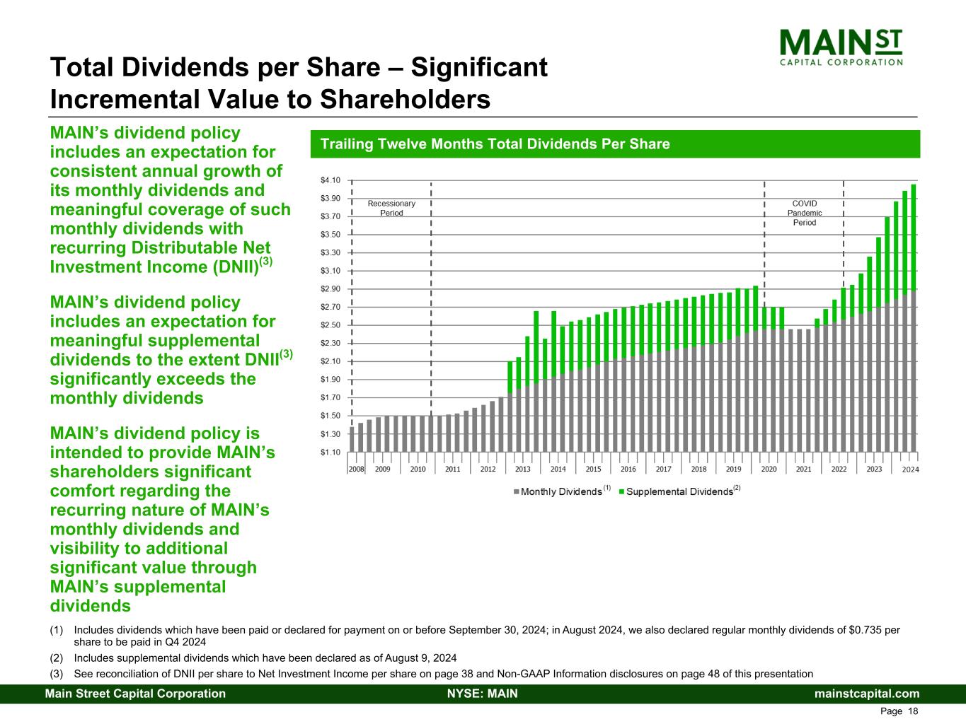 mainstcapital.comNYSE: MAINMain Street Capital Corporation www.mainstcapital.com Page 17 (1) Initial Public Offering, or IPO, in October 2007 (2) As of and based upon the closing market price on August 8, 2024 of $48.79 per share and the annualized most recently declared monthly dividends (3) As of and based upon the closing market price on August 8, 2024 of $48.79 per share and the annualized most recently declared monthly dividends and supplemental dividend declared for the third quarter of 2024 (4) Based upon dividends which have been paid or declared as of August 9, 2024 Monthly Dividends Per Share – Sustainable Growth Recurring monthly dividend has never been decreased and has grown meaningfully (123%) since IPO(1) Based upon the current annualized monthly dividends declared for the fourth quarter of 2024, the annual effective yield on MAIN’s stock is 6.0%(2) Based upon the current annualized total monthly dividends and supplemental dividend declared for the third quarter of 2024, the annual effective yield on MAIN’s stock is 8.5%(3) MAIN has also paid or declared supplemental dividends of $6.34(4) per share since IPO(1) Cumulative dividends paid or declared, including supplemental dividends, since IPO(1) (at $15.00 per share) through fourth quarter of 2024 equal $42.625 per share(4) Trailing Twelve Months Monthly Dividends Per Share
