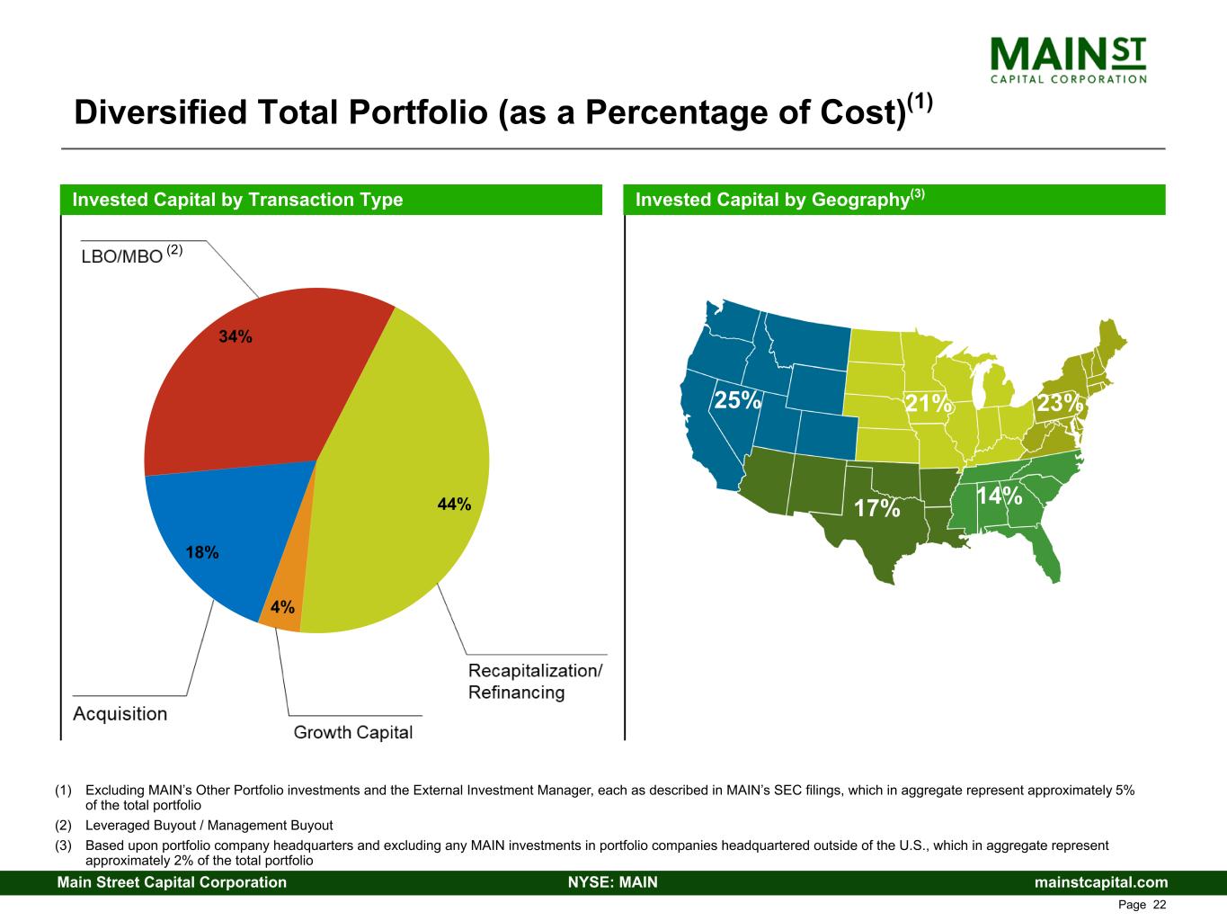 mainstcapital.comNYSE: MAINMain Street Capital Corporation www.mainstcapital.com Page 21 Total Portfolio by Industry (as a Percentage of Cost)(1) (1) Excluding MAIN’s Other Portfolio investments and the External Investment Manager, each as described in MAIN’s SEC filings, which in aggregate represent approximately 5% of the total portfolio